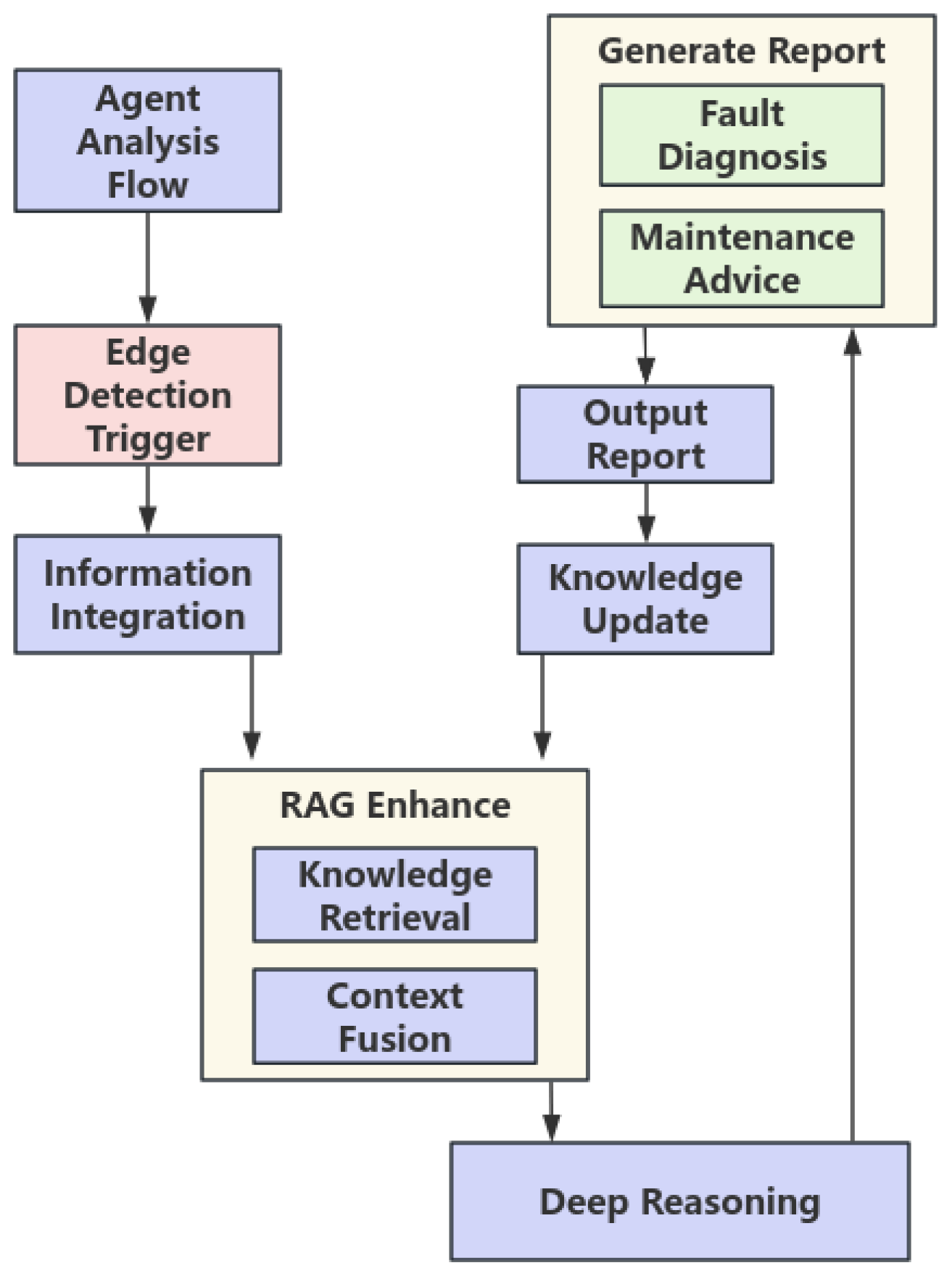 22], while possessing powerful long-sequence modeling capabilities, has high computational complexity and a uniform positional encoding mechanism. This makes it unsuitable for resource-constrained edge environments and ineffective at capturing the event-driven nature of industrial data. Additionally, most existing diagnostic systems stop at fault classification, lacking the ability to combine physical evidence with domain knowledge for root cause analysis and repair suggestion generation. In industrial intelligent diagnosis, interpretability is critical to credible and applicable diagnostic conclusions. Zhao [