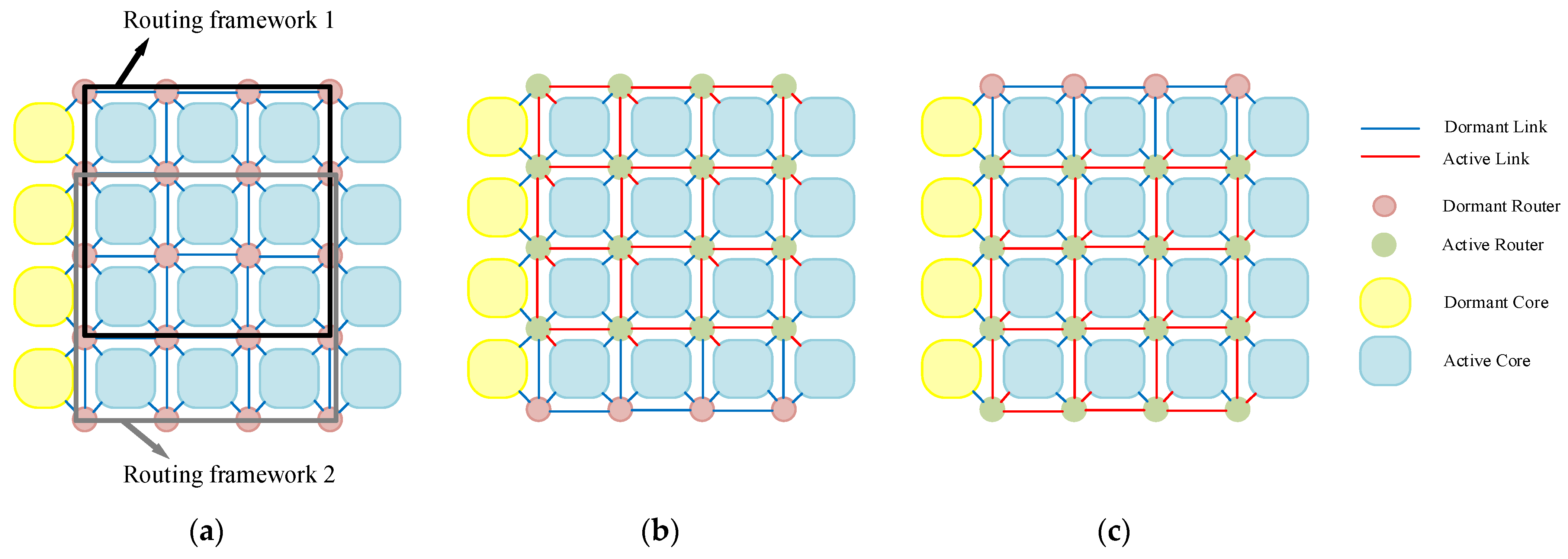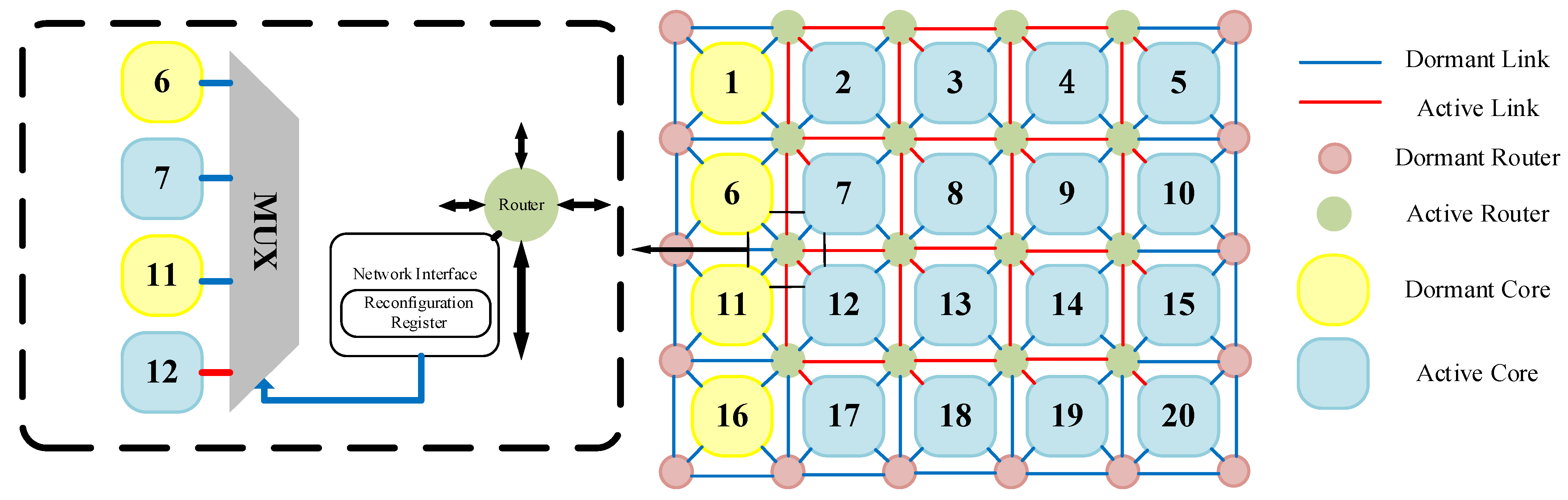 - Zhang, L.; Han, Y.; Xu, Q.; Li, X.; Li, H. On Topology Reconfiguration for Defect-Tolerant NoC-Based Homogeneous Manycore Systems. IEEE Trans. Very Large Scale Integr. (VLSI) Syst. 2009, 17, 1173–1186. [Google Scholar] [CrossRef]