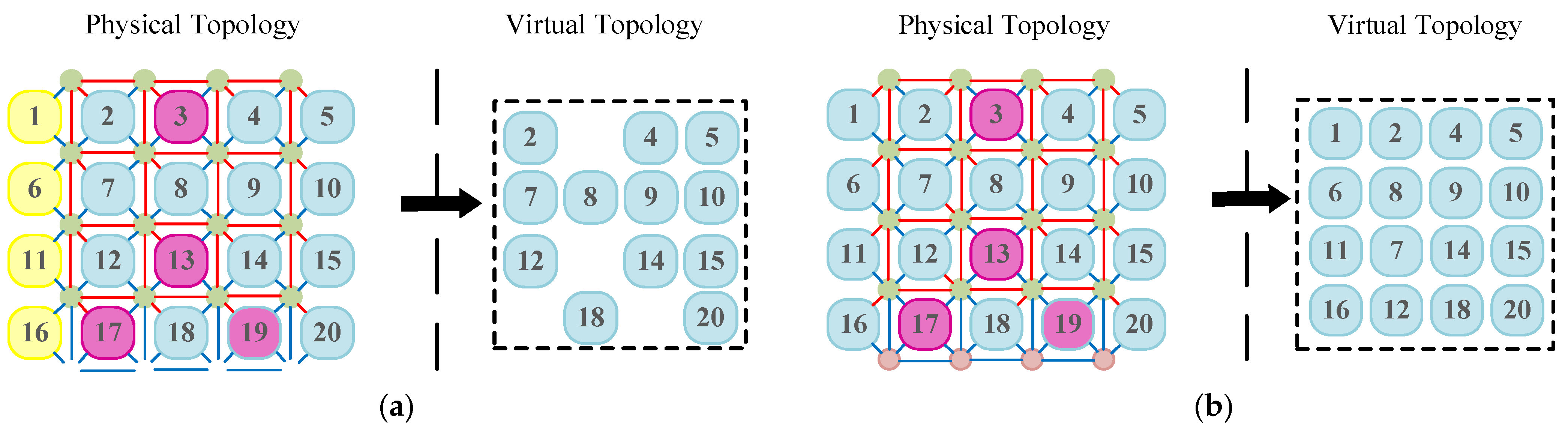 - The basic approach of the aforementioned methods still involves searching for feasible solutions within the global candidate mapping space. When selecting an adjacent healthy node to replace a failed node, this can easily trigger a chain reaction of healthy node replacements and result in the unnecessary consumption of redundant nodes;