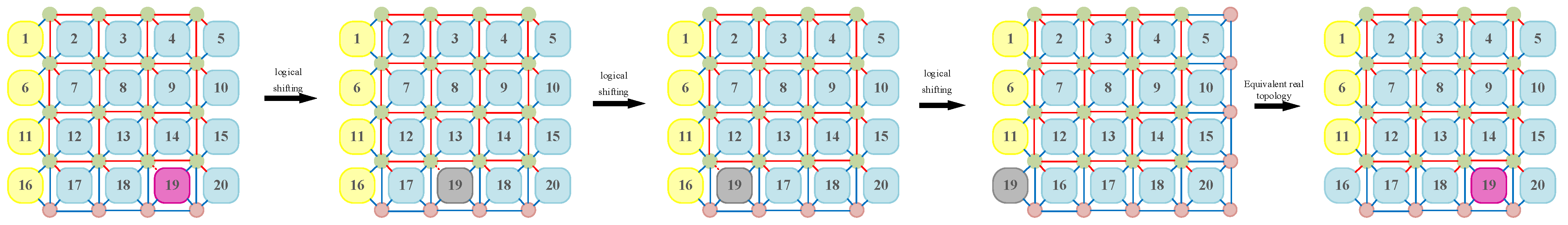 - Niu, N.; Fu, F.-F.; Li, H.; Lai, F.-C.; Wang, J.-X. A Novel Topology Reconfiguration Backtracking Algorithm for 2D REmesh Networks-on-Chip. In Parallel Architecture, Algorithm and Programming; Springer: Singapore, 2017; pp. 51–58. [Google Scholar] [CrossRef]