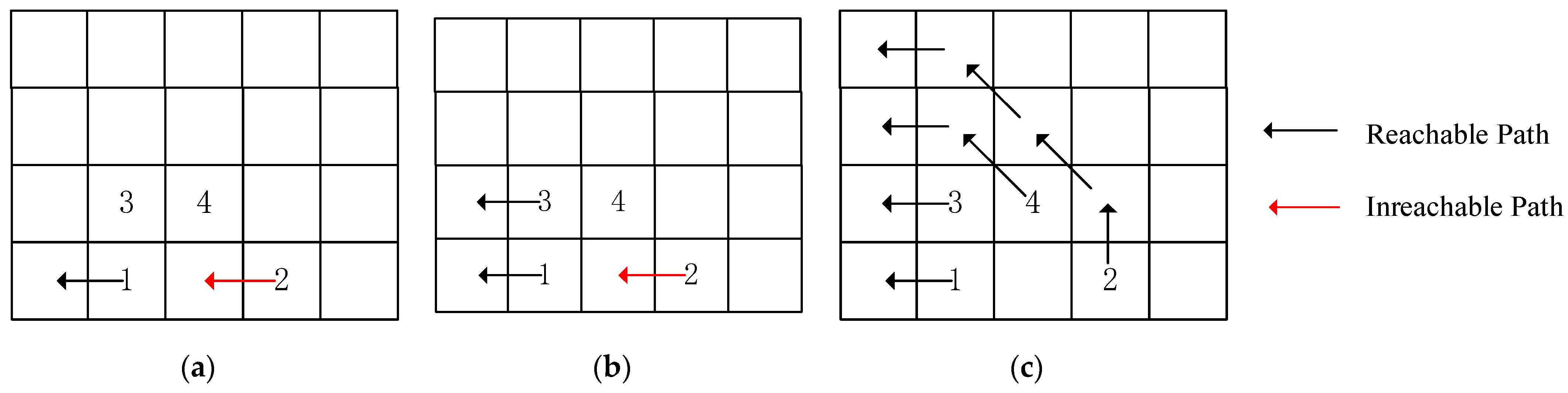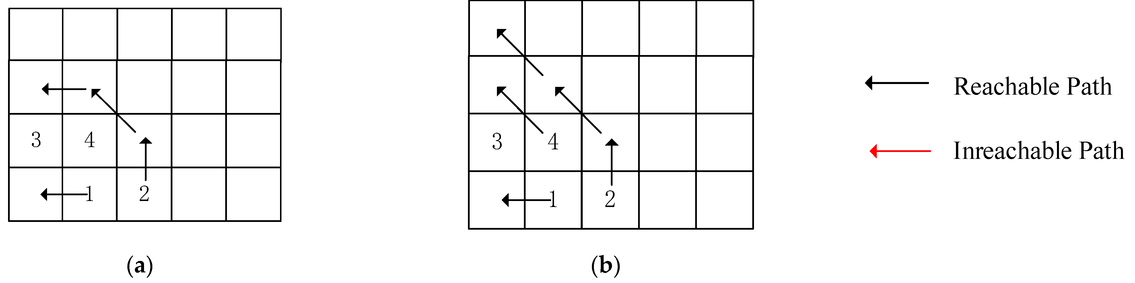 - Local Backtracking Mechanism: During each search for monotonic paths, conflict detection is performed. If a conflict occurs, a local backtracking is executed by advancing the search order of the node causing the conflict. Since we have specified an initial search order, depending on the selected routing framework, conflict nodes only need to be sought within the upper-left/lower-left regions. The feasibility of this approach is demonstrated by Theorem 2 and 3 in the subsequent discussion.