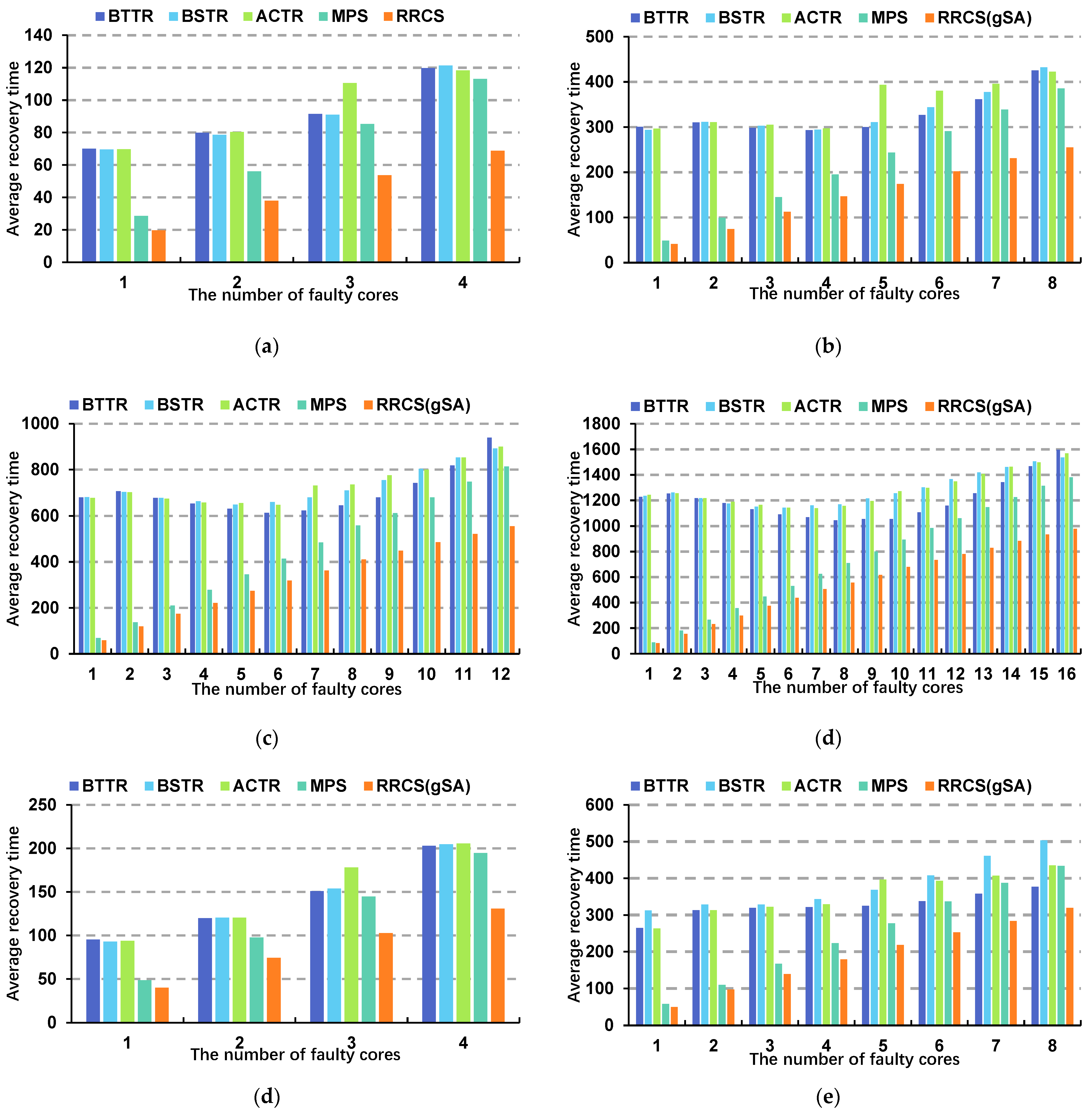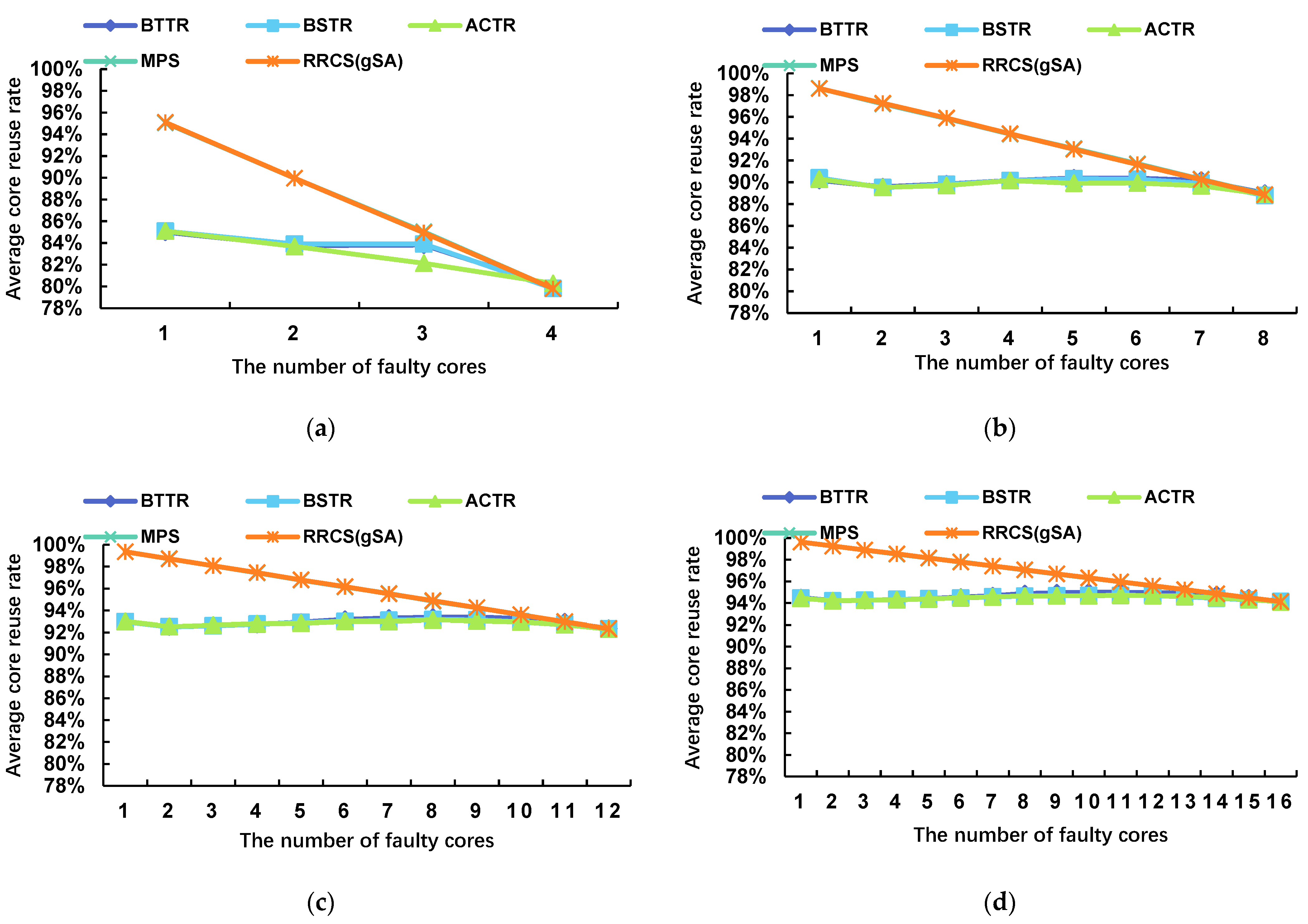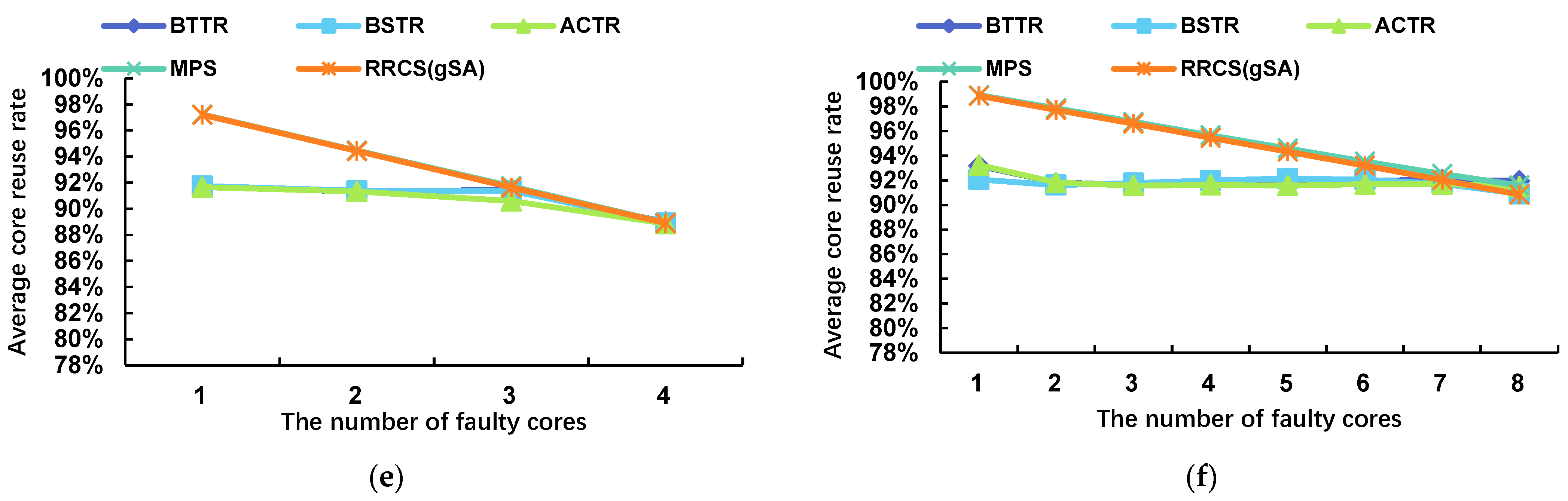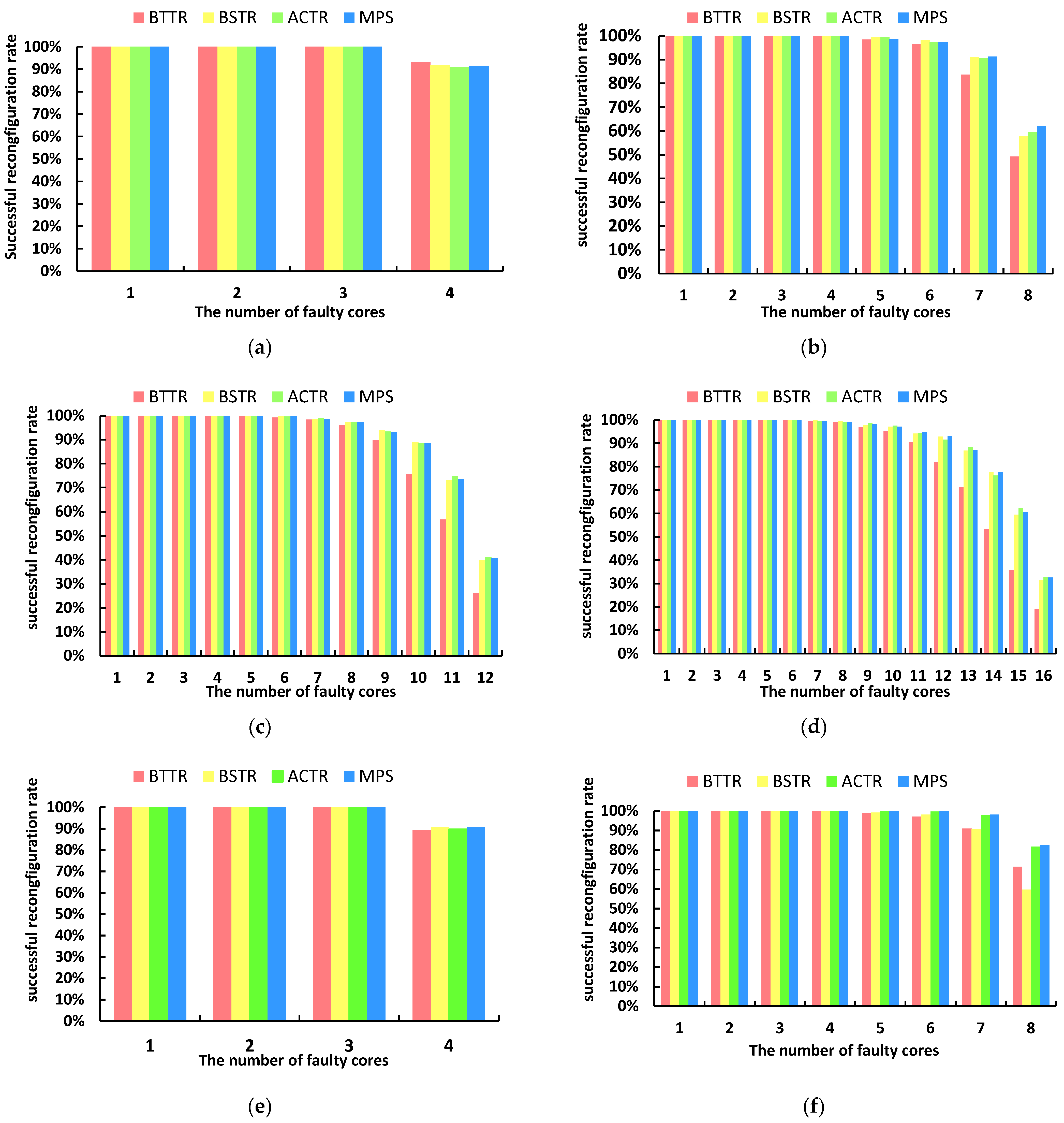 - We evaluate algorithms based on recovery cost rather than merely their ability to find feasible solutions. Experiments across various scales and fault distributions demonstrate that MPS, while maintaining reconstruction success rates comparable to those of BSTR, BTTR, and ACTR, significantly improves core reuse rates and reduces average recovery time, with particularly pronounced advantages in large-scale, low-fault-rate scenarios [23,24,25].