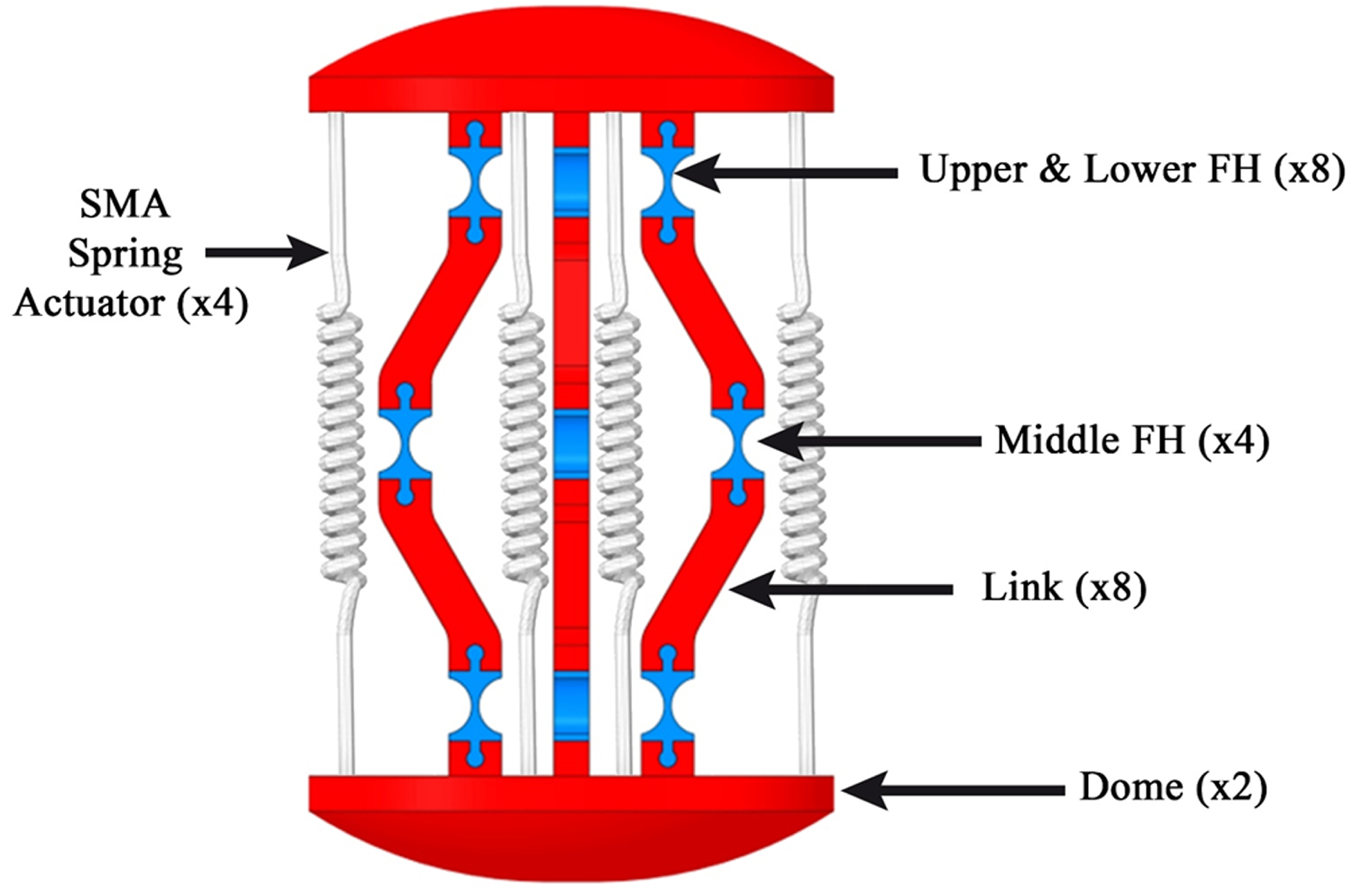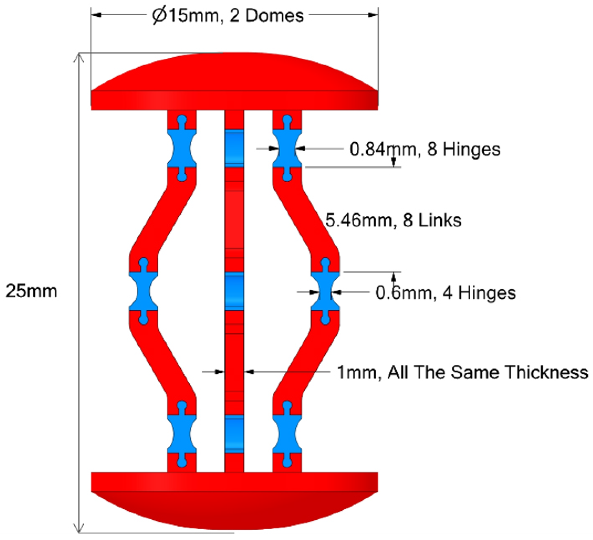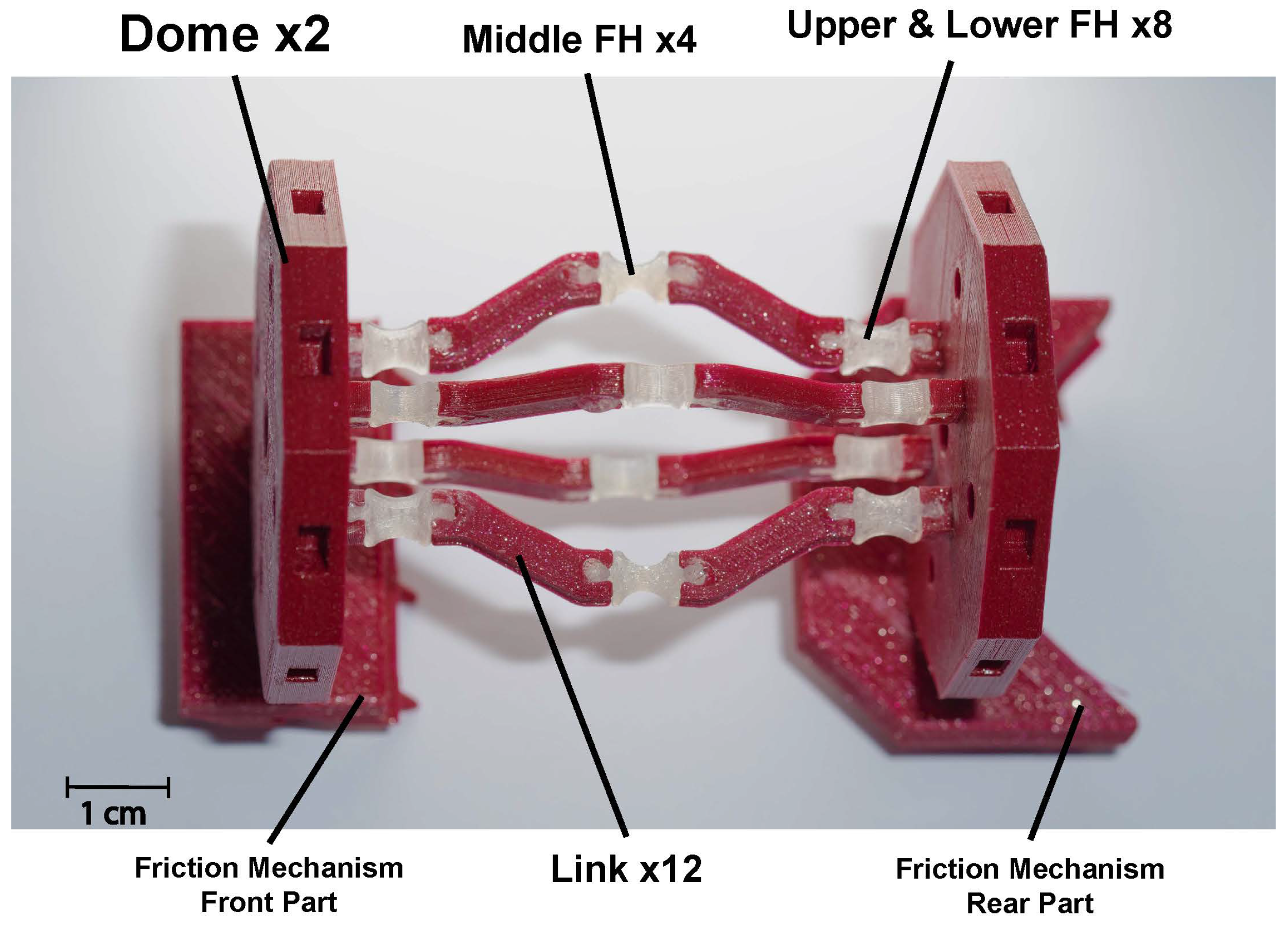 Material selection is crucial in the capsule’s design, with an emphasis on mechanical performance and biocompatibility. The thermoplastic polyurethane (TPU) 92A was selected for its flexibility, exhibiting a Young’s modulus of 15.3 MPa for the construction of the flexure hinges (FHs). In contrast, polylactic acid (PLA) was chosen for its structural rigidity, having a Young’s modulus of 3450 MPa, to fabricate the dome and link components, as outlined in