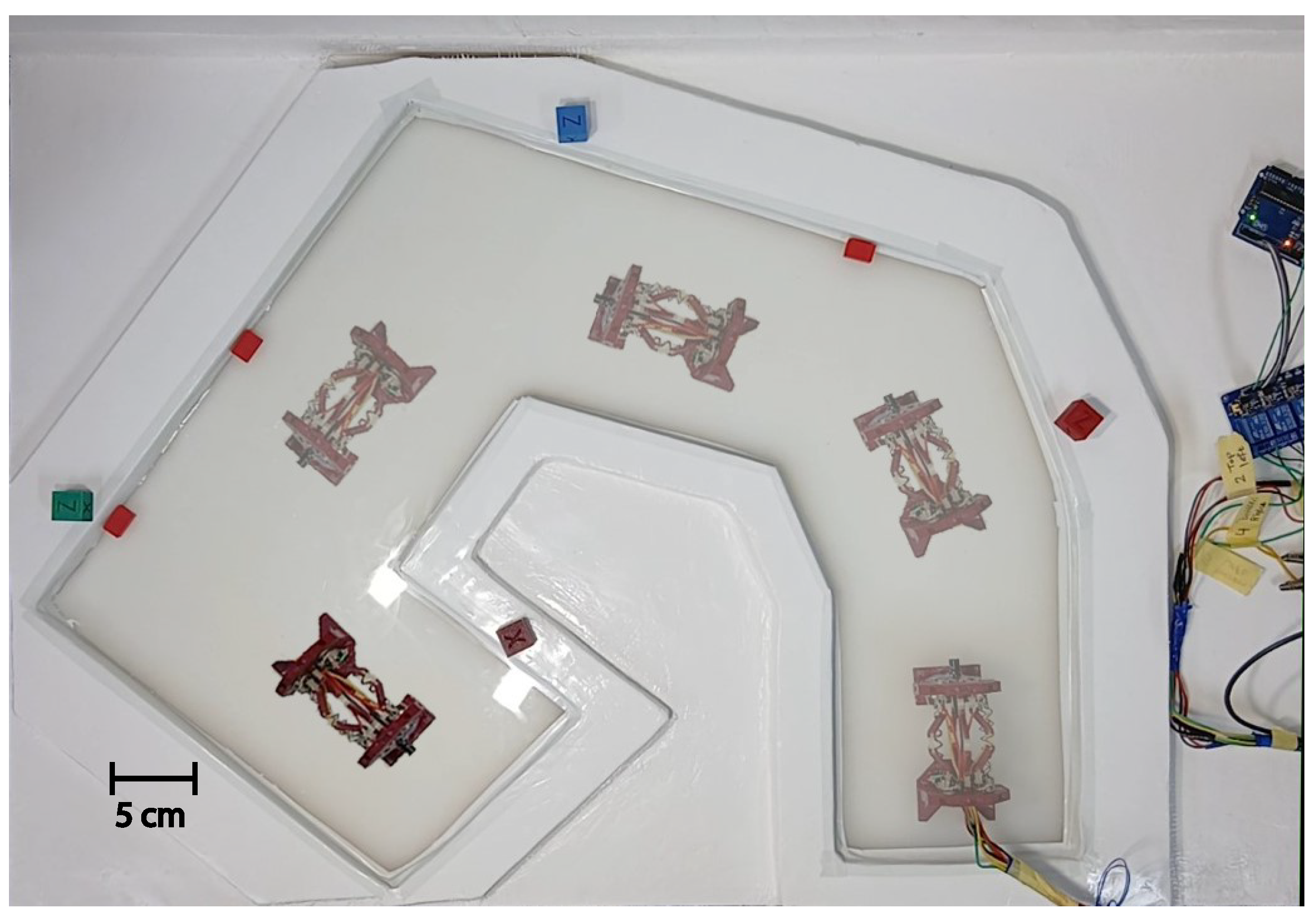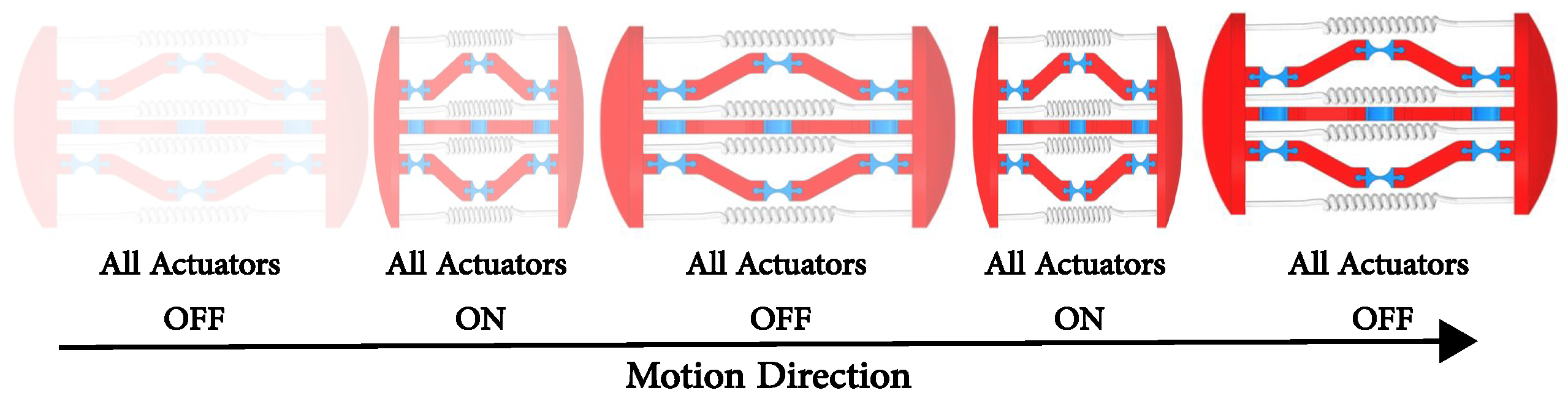 Figure 16. Forward motion was successfully achieved through the alternating activation of shape memory alloy (SMA) actuators, yielding consistent displacements of 5 mm (refer to
