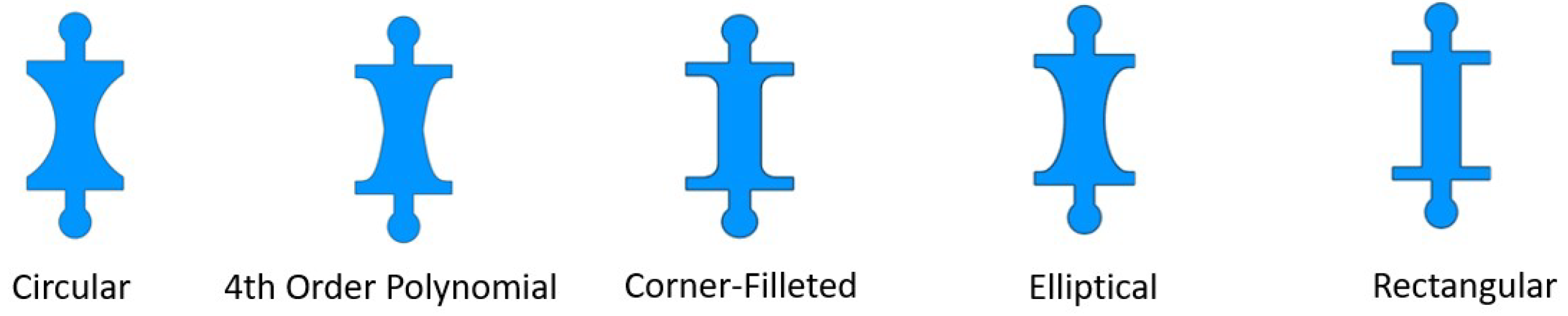 After conducting nonlinear finite element analysis (FEA) simulations on several notch geometries using ANSYS Workbench, we present the results for five distinct notch shapes: circular, elliptical, rectangular, corner-filleted, and 4th-order polynomial. These results are illustrated in