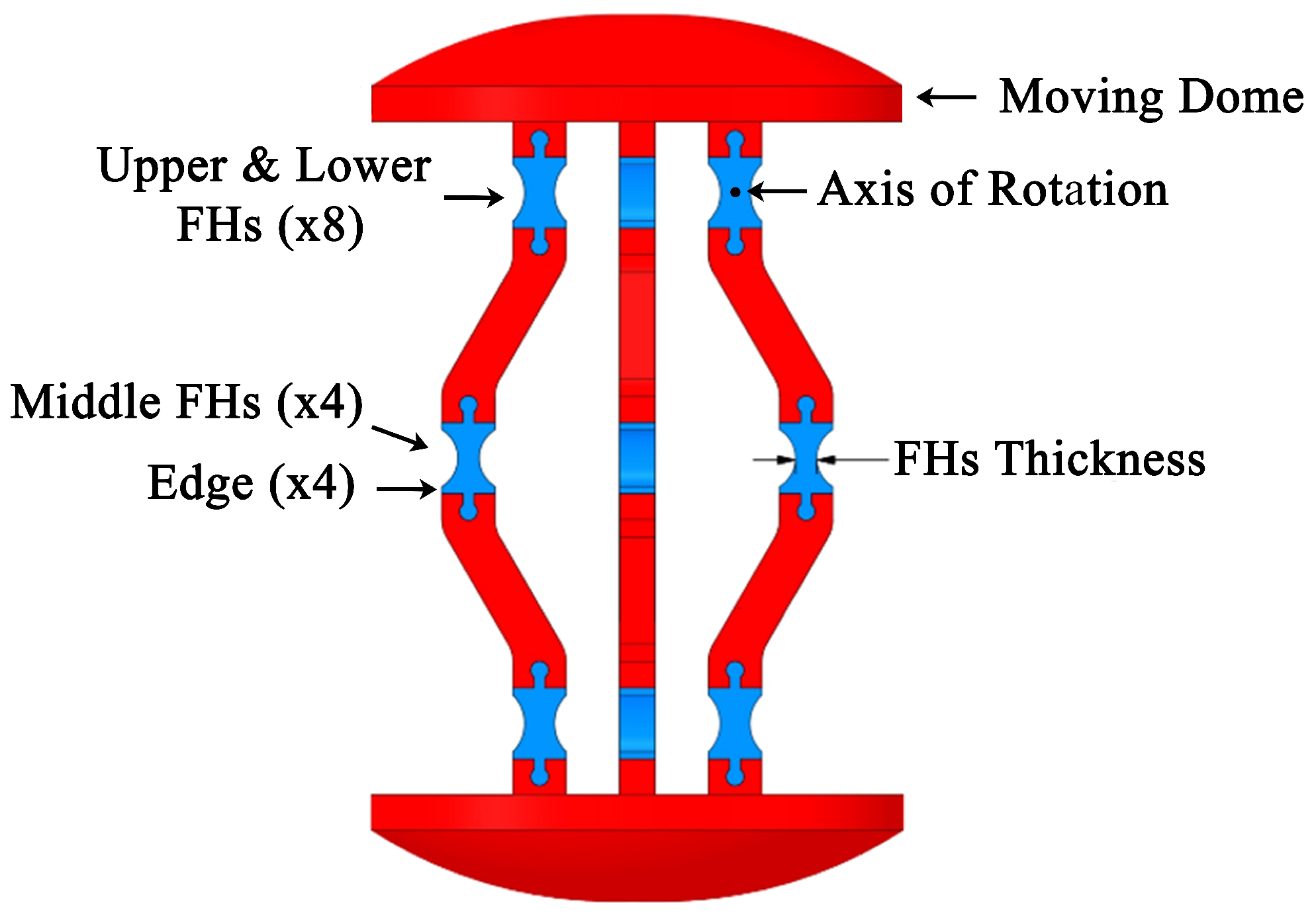 Figure 11. As anticipated, the maximum von Mises stress is concentrated at the middle FHs, yielding a safety factor of 1.56 and a maximum deformation of the moving dome of 1.98 mm. Furthermore, the finite element analysis results indicate that the stress experienced by the upper and lower FHs is 2.3 MPa, while the middle FHs experiences a stress of 3.62 MPa, as illustrated in