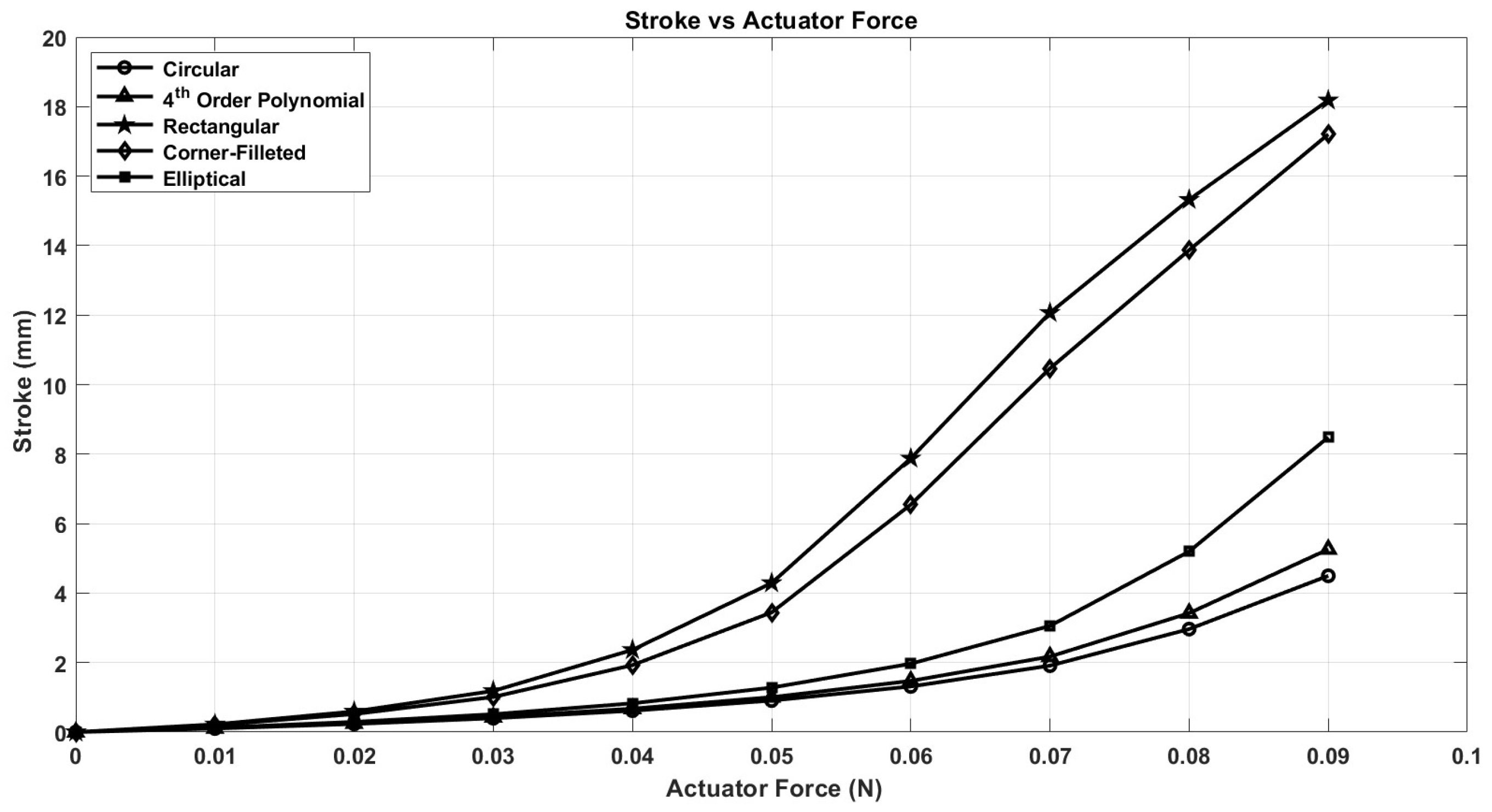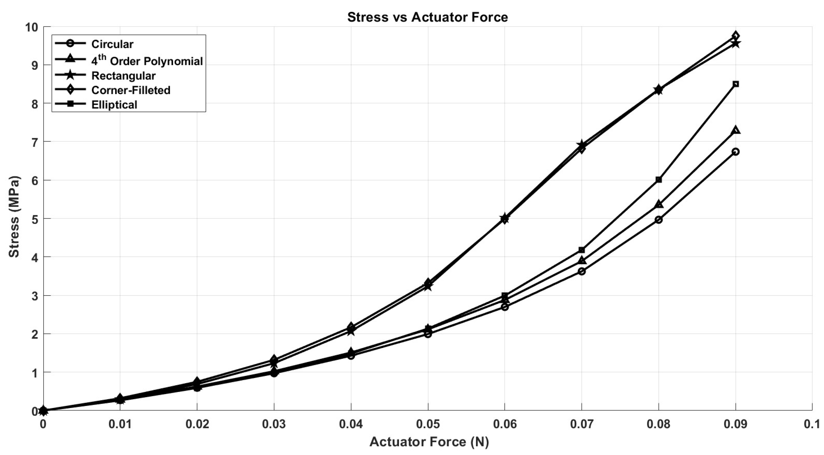 Figure 8, it is evident that under equivalent actuator forces, the stroke value of the capsule is maximized with the rectangular notch shape and minimized with the circular notch shape. At first glance, this suggests that the rectangular shape may be the superior option; however, several other factors must be considered to determine the optimal notch shape. One notable factor is the stress distribution associated with each notch design. The circular notch shape shows a lower stress profile for a given input force when compared to the other geometries evaluated. This advantage arises from its smooth, continuous curvature, which minimizes stress concentration points that are typically present in shapes with sharp corners. Conversely, rectangular notches are prone to stress concentration due to their geometric discontinuities; the sharp corners of these notches catalyze localized areas of high stress, thus increasing the likelihood of structural failure.