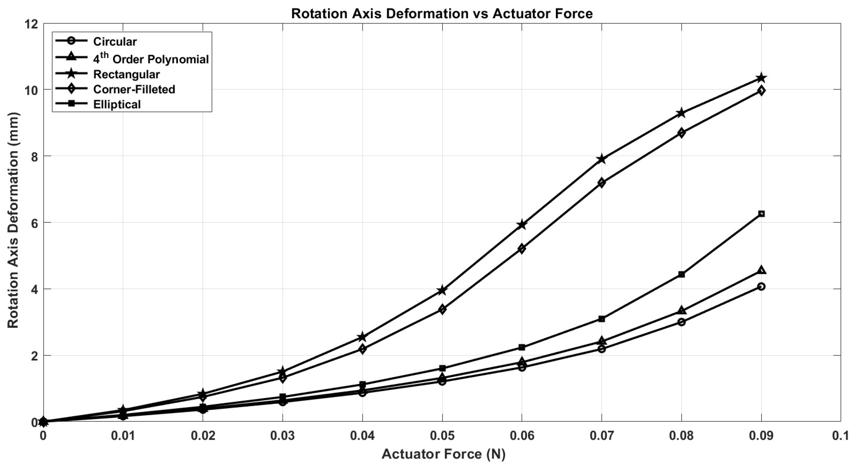 The deformation experienced at the axis of rotation of the middle FH structures, termed axis shift, is an additional factor influencing the choice of notch shape, as it directly impacts the accuracy of the capsule’s dynamic model. It is important to note that accuracy improves with a decrease in axis shift. As demonstrated in