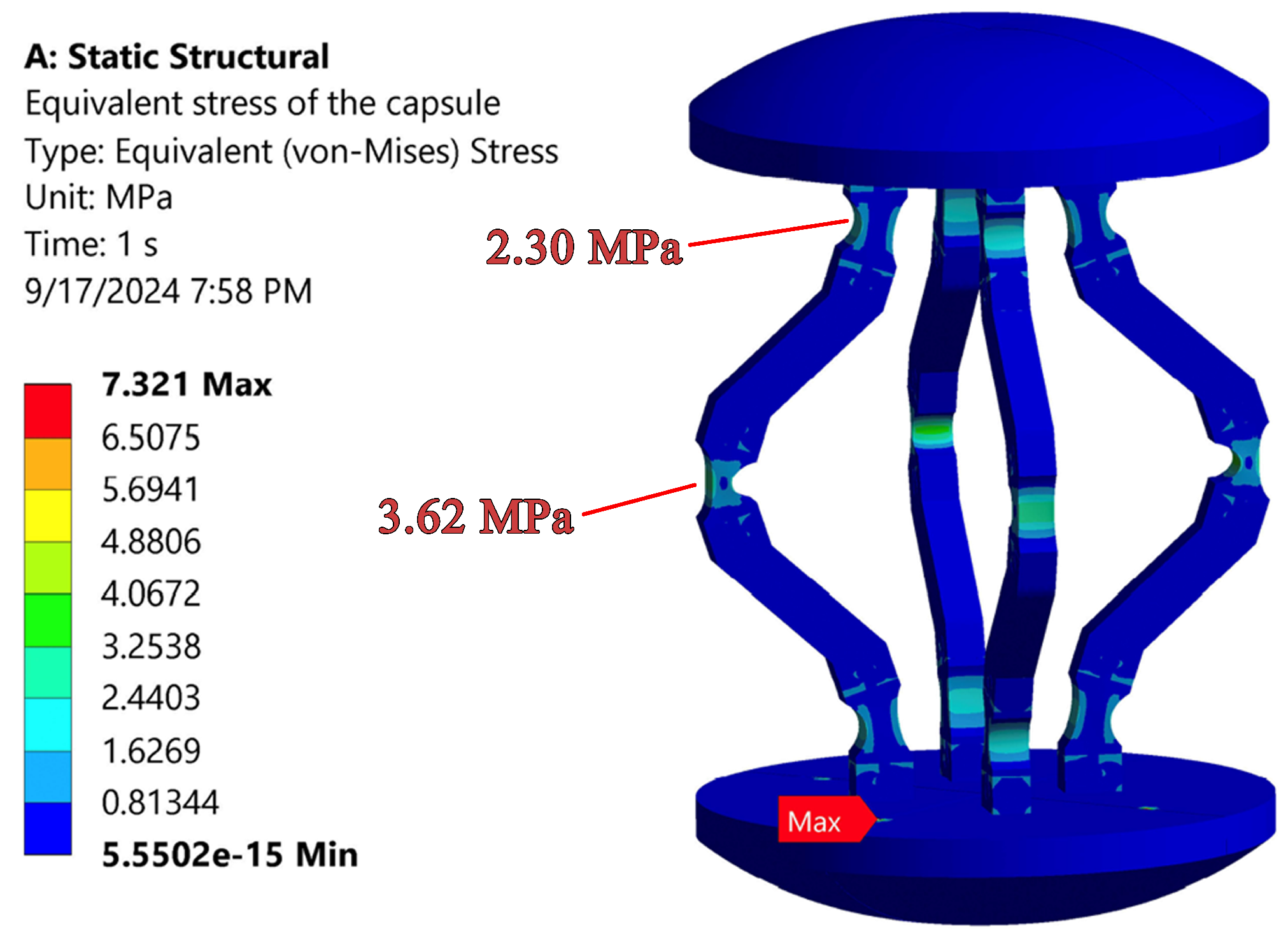 To optimize the capsule’s performance, a nonlinear finite element analysis (FEA) was performed using ANSYS 2021 R1 Workbench, which accounted for the material nonlinearity and the large deformations of the capsule. This analysis involved the systematic evaluation of several notch shapes of hinge geometries, as depicted in