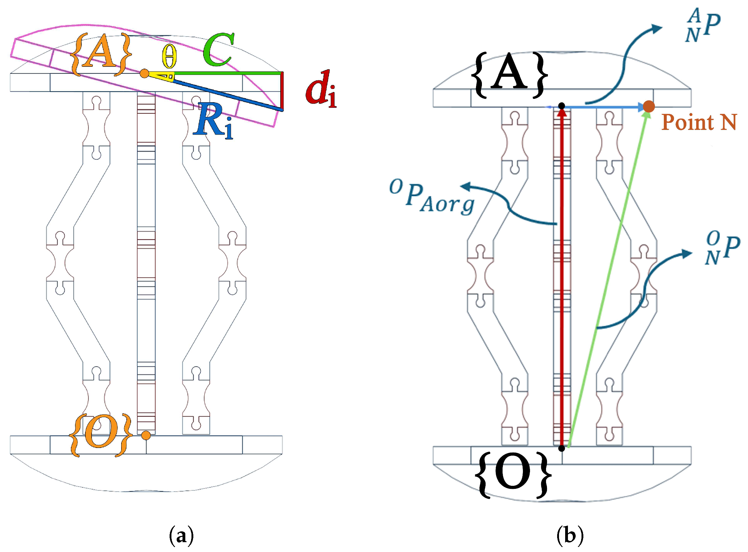 By combining the position vectors defined in Equations (2)–(4) with the rotation matrices presented in Equations (5)–(9), the spatial orientation of the moving platform can be determined relative to the fixed base frame. This formulation allows the transformation between actuator displacements and the orientation of the capsule tip.