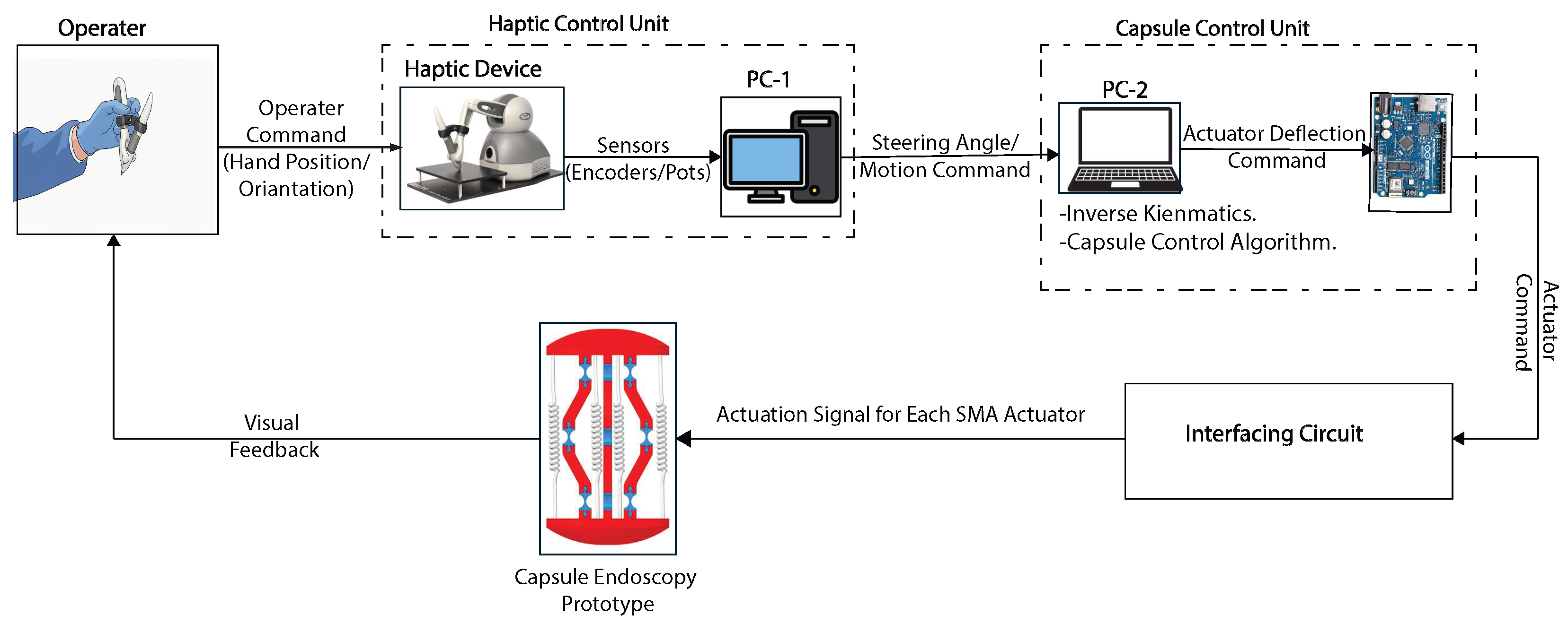 Design and integration of a haptic control interface that allows the operator to orient the capsule endoscope tip, thereby facilitating the intuitive control of the viewing direction.