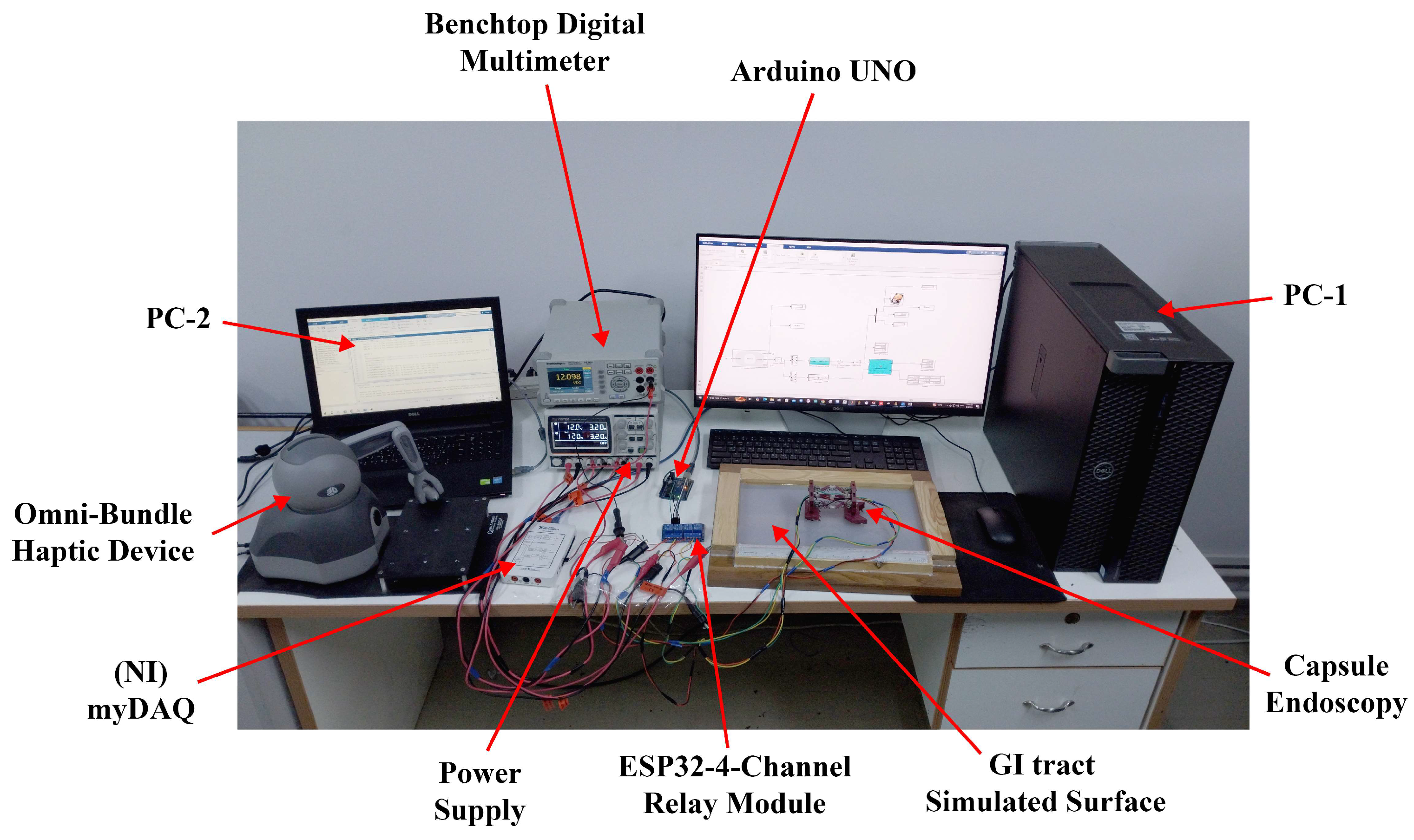 The integrated capsule system comprised a mechanical platform paired with an Omni Bundle haptic interface for operator control. Experimental evaluations were conducted on a silicone-rubber surface, as illustrated in