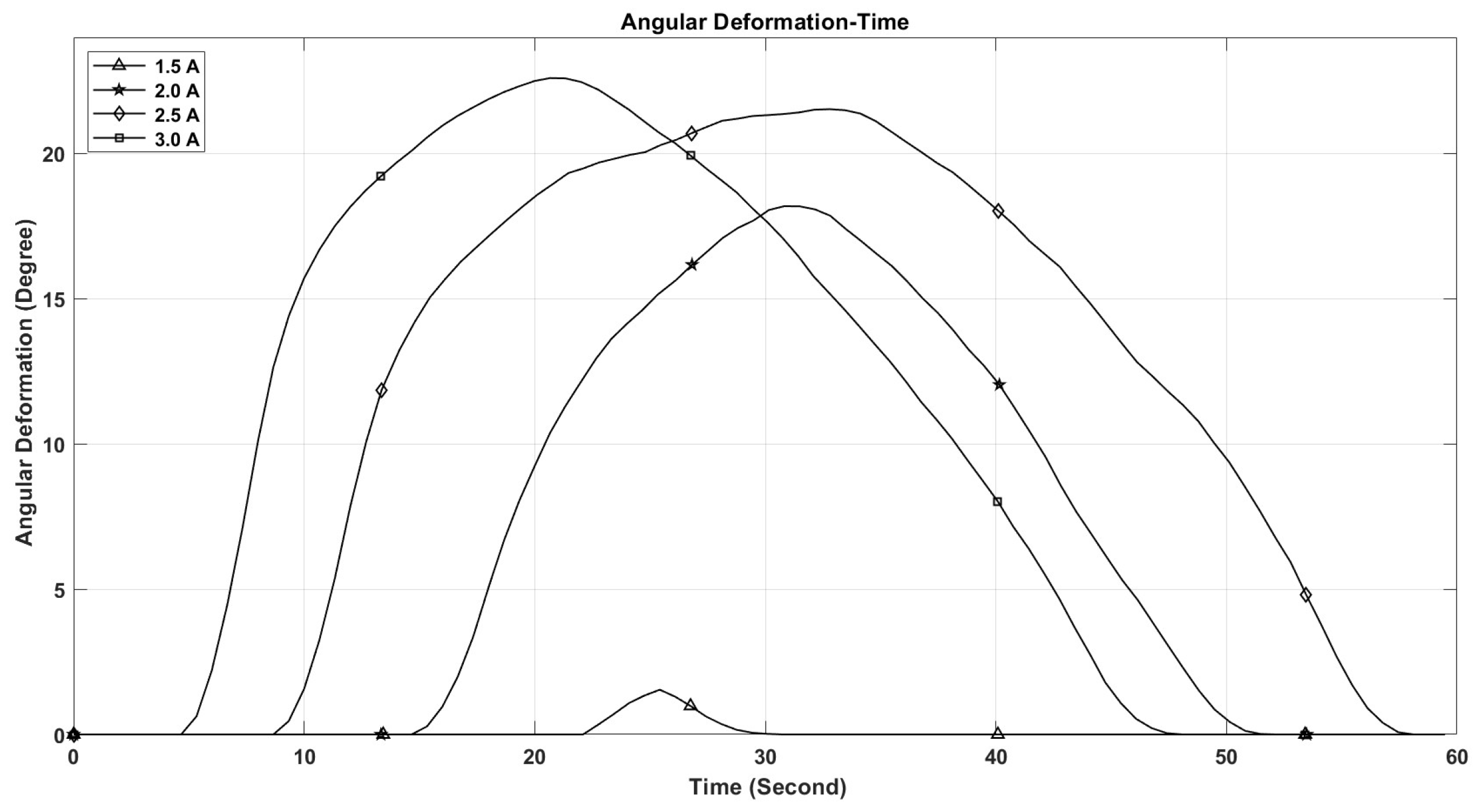 Figure 21. This phenomenon accounts for the observed enhancements in stroke, speed, and angular deformation of the actuator with increasing current, as shown in