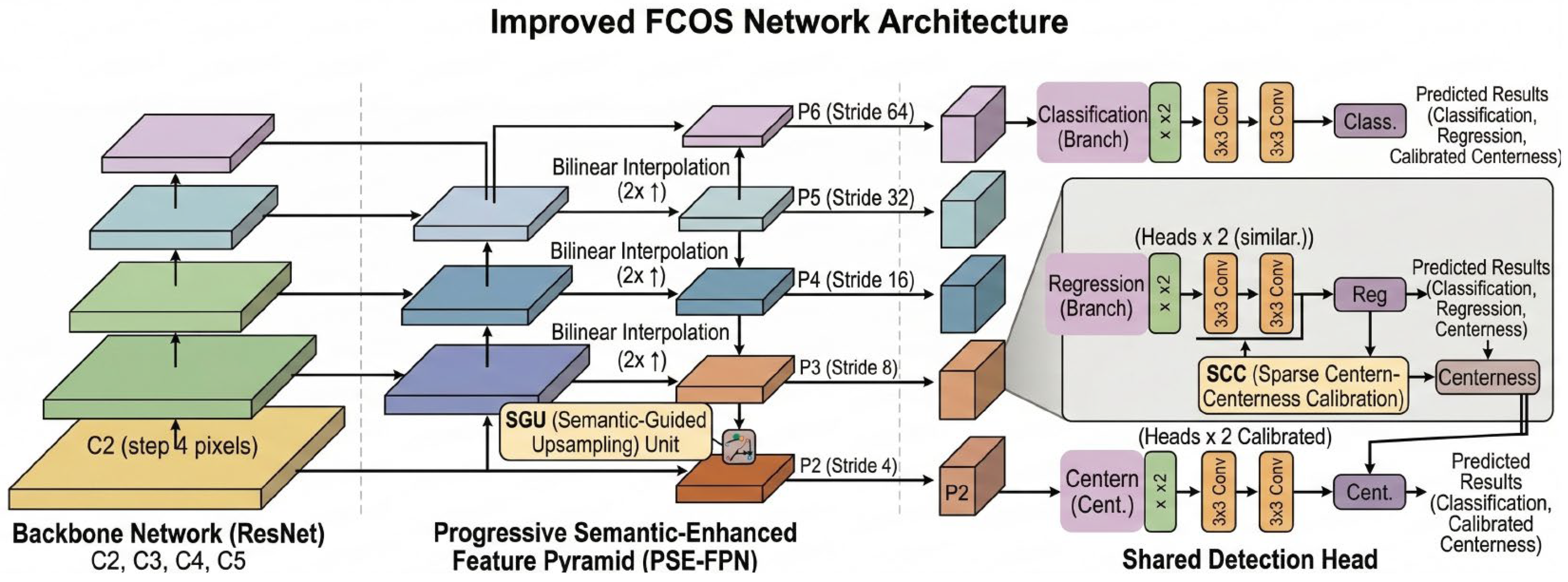 Our method introduces two synergistic components: the Semantic-Guided Upsampling Unit (SGU) and the Sparse Center-ness Calibration (SCC) module. Together, they mitigate two primary limitations of current anchor-free detectors: semantic misalignment during feature fusion and inefficient quality estimation caused by dense supervision. Specifically, the SGU is integrated into a Progressive Semantic-Enhanced Feature Pyramid Network (PSE-FPN). This progressive network extends multi-scale representations to the high-resolution P2 level, effectively strengthening the bottom-up semantic flow. Simultaneously, the SCC module is embedded directly into the detection head to provide sparse, high-confidence localization supervision.