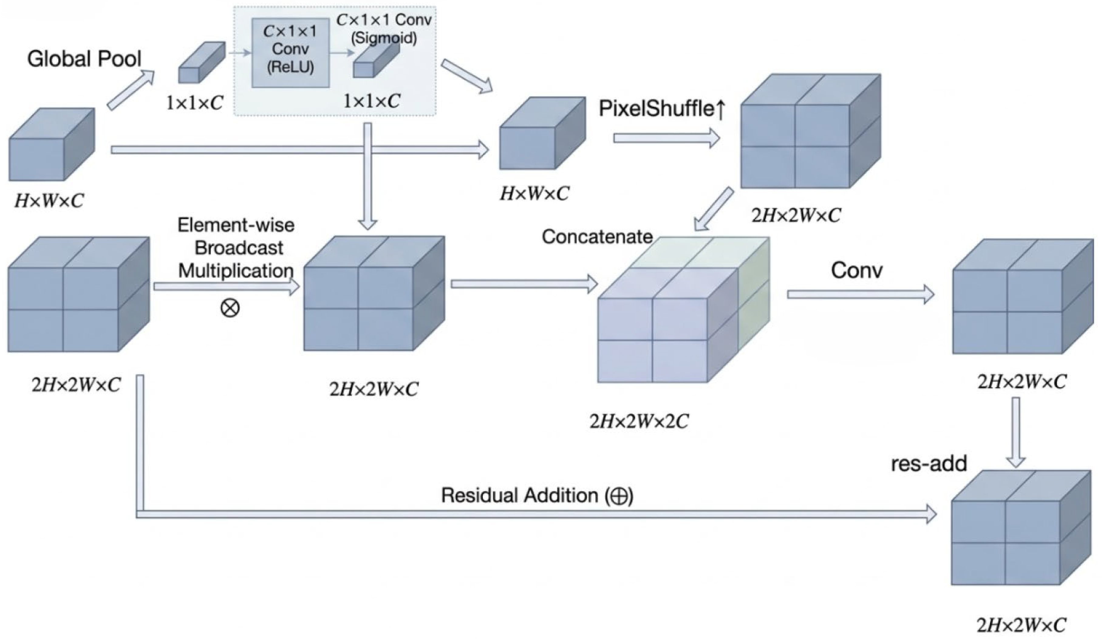 Sub-pixel convolution (PixelShuffle) replaces global scaling operations, achieving simultaneous enhancement of detail recovery and semantic coherence.