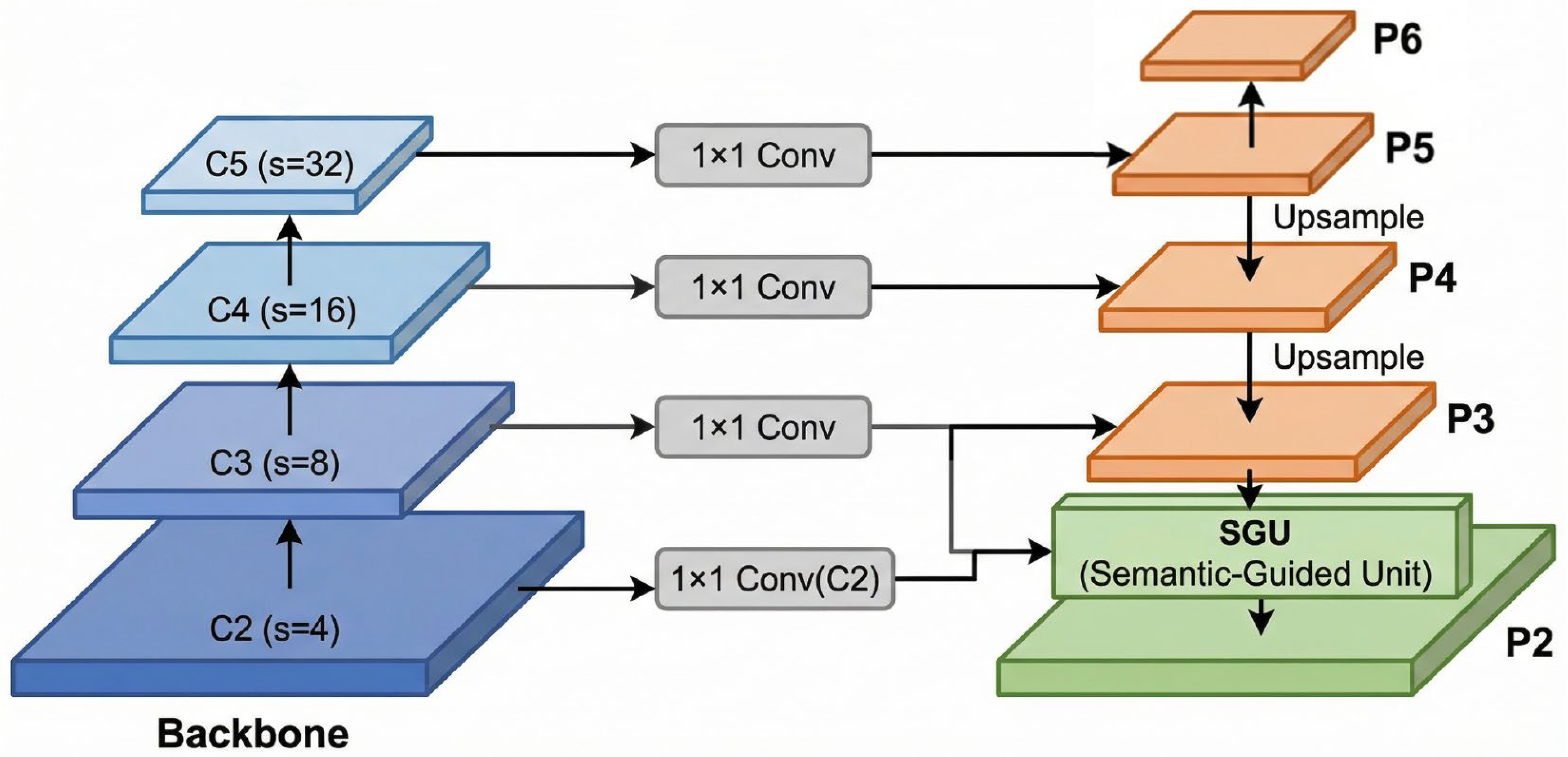 The performance of one-stage dense detectors like FCOS heavily relies on the expressive power of the Feature Pyramid Network (FPN). To further improve micro-defect detection accuracy in real-world Automated Optical Inspection (AOI) scenarios, we integrate the SGU unit into FCOS’s FPN architecture and introduce an additional high-resolution level—P2—to strengthen semantic perception in early layers.