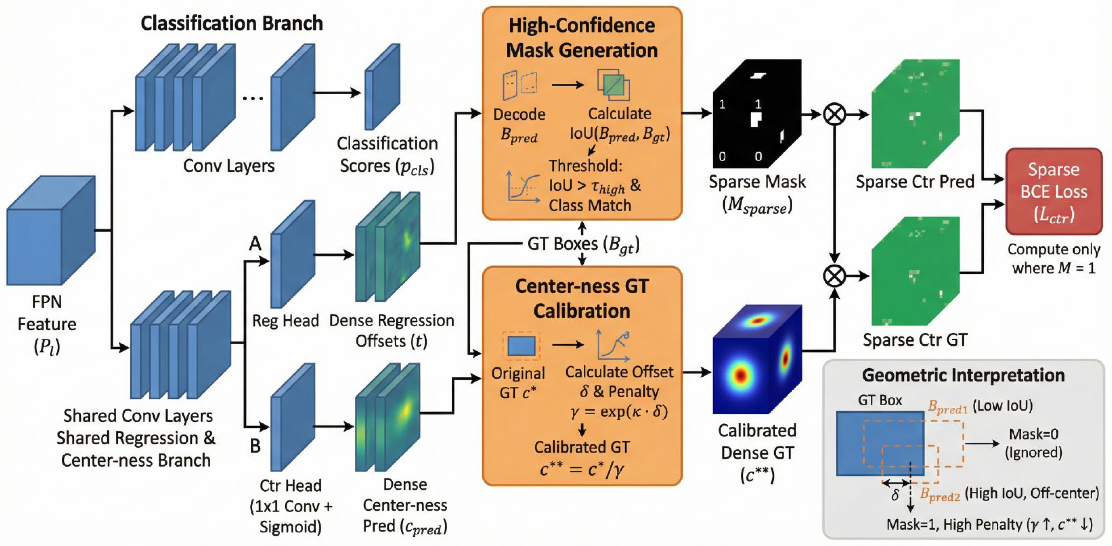 Despite their advancements, all these works maintain the fundamental “dense prediction + per-pixel center-ness” framework of FCOS. Crucially, the center-ness branch still assigns supervision signals uniformly across all pixels within ground-truth boxes—even those near edges—leading to noisy gradients and poor discrimination between central and marginal predictions. During NMS, this results in the survival of low-quality boxes, especially detrimental for micro-targets where precise spatial focus is essential.