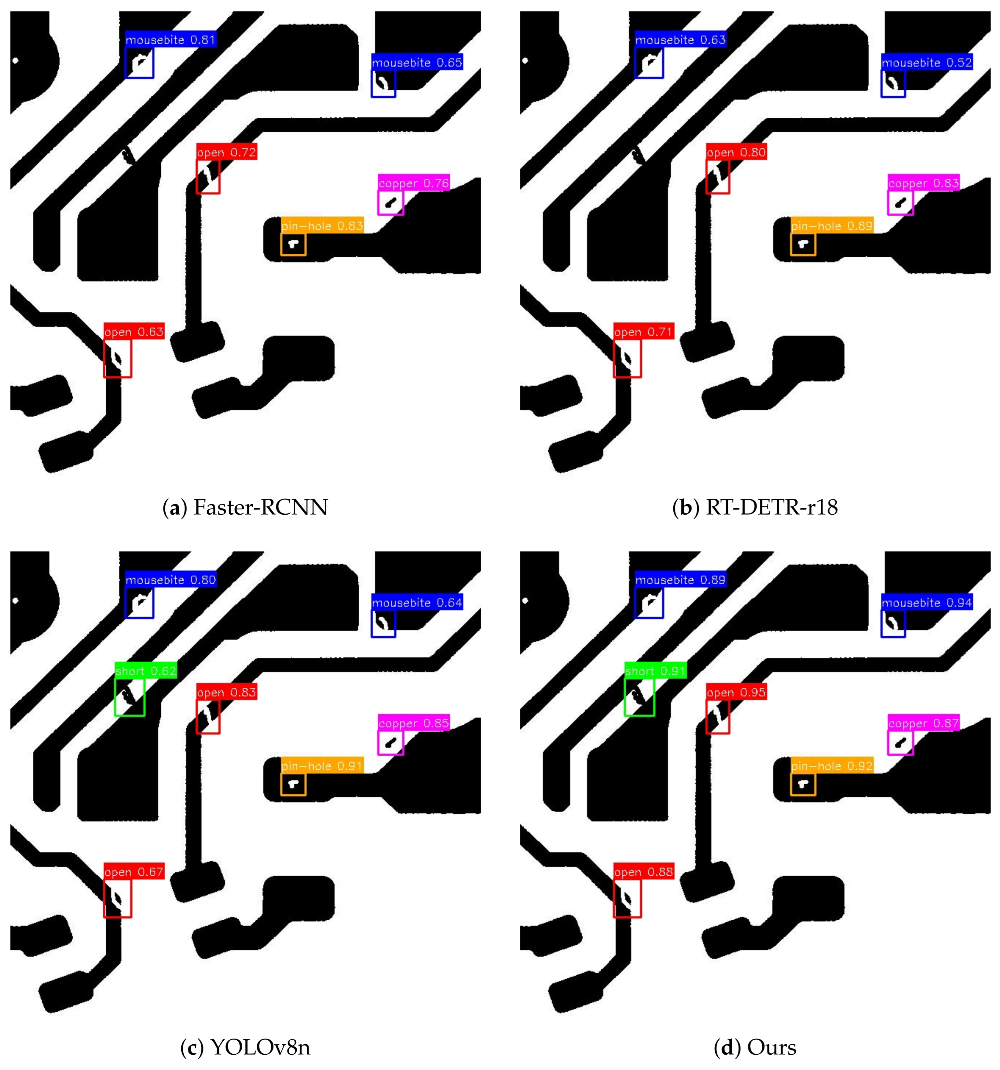 For real-world semiconductor metrology, application validation on the DeepPCB dataset yields a superior mAP@0.5 of 98.7%. Our method significantly outperforms contemporary detectors, such as YOLOv8s and RT-DETR-r18. This performance confirms the framework’s strong generalization ability and its robustness against the complex, repetitive backgrounds of circuit traces. Notably, these gains are achieved without relying on heavy Transformer architectures or complex label assignment strategies.