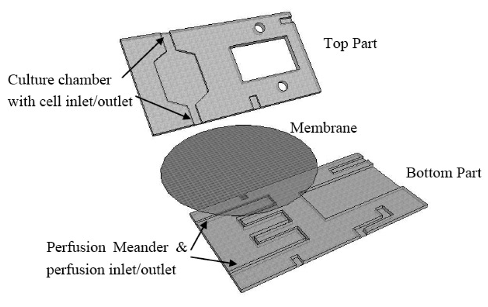 The device is fabricated by micromilling in Polycarbonate Sheets. The bottom part contains a meander channel (1 mm wide, 300 μm deep) for perfusion and a slot for sliding in glass slides (56 × 26.2 mm). The top part contains a cell culture chamber (250 μm deep) with a cell inlet channel and a cell outlet channel connected to the splashing chamber's fixed cells inlet. It also includes another channel to act as an inlet for splashing water on the glass slide. A polycarbonate membrane (5 μm pore size) is sandwiched between the perfusion channel and the cell culture chamber during the bonding process of the two parts. The two parts are bonded together using UV activated bonding [47]. First the two parts are wiped clean with IPA followed by rigorous wash with a detergent soap and water. Subsequently the two parts are thoroughly air dried and exposed to UV for 45 s. Before putting the two parts together a PC membrane and interconnection plugs (Silicon tubing: Outer Diameter (OD) 3 mm, Inner Diameter (ID) 1 mm) are placed on the lower part. A Silicon tubing U-plug is placed at the cell outlet of the culture chamber and connected to the fixed cells inlet of the splashing chamber. Finally, the top part is placed on the lower part and put in a P/O/Weber bonding press at 130 °C for 30 min.