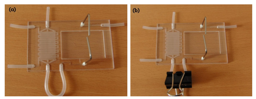 In order to connect the culture chamber and splashing device, we have devised a simple and easy paper clip based valving strategy. This strategy was adopted in order to utilize tools commonly available in the cell labs and also to keep the protocol simple. A 3 mm OD silicone tubing is bonded from the cells outlet to the cells inlet of the splashing device (Figure 2). The tubing forms an external U-section out of the device providing enough room for putting on a paper clip to stop the flow. The paper clip valve was tested at increasing flow rates to identify the maximum permissible flow rate before leakage occurs and to validate the applicability of these valves for the cell culture protocol. The flow rate was increased gradually using a syringe pump and the flow rate at which the device leaked was recorded.