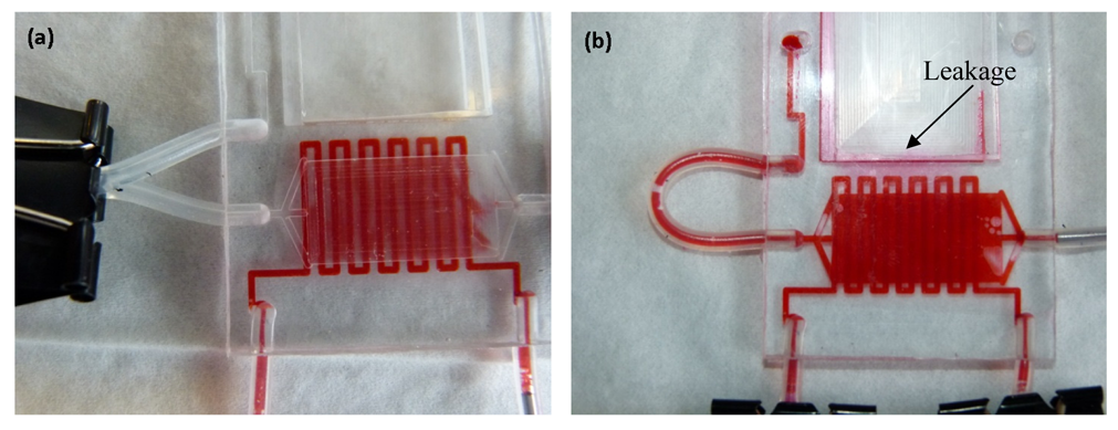 The paper clip based valving technique was tested for isolation between the culture chamber and the splashing chamber until the cells had been fixed in the culture chamber for 72 h. The FISHprep devices were tested for increasing flow rates starting from 150 μL/h up to 750 μL/h. The flow rate of 150 μL/h represents the maximum perfusion rate for the fixation protocol used for sample preparation in the culture and fixation chamber (Figure 3(a)). The first signs of leakage in the device were visible only after 500 μL/min flow rate due to lateral flow in the PC membrane at the bonding interface (Figure 3(b)). Even at such high flow rates, there was no flow through the paper clip valve; the leakage only occurred through the short bonding edge in the FISHprep device. Also, it was noticed that the device was still functioning well without any leakage, when the flow rate was again reduced to 150 μL/h (Figure 3(b)).