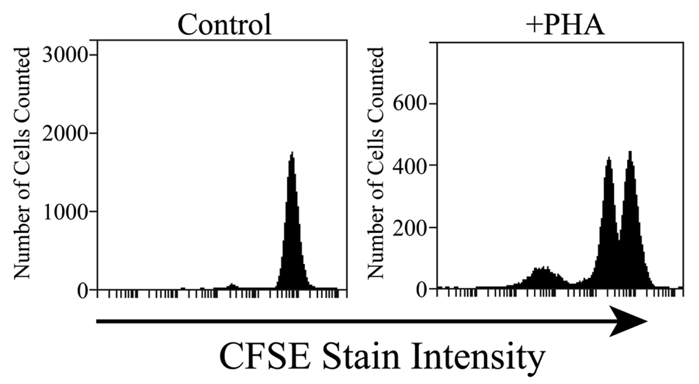 The cells collected from the FISHprep culture chamber were analyzed in a flow cytometer by using CFSE staining of the cells. CFSE stain is retained within the cells throughout development and mitosis. On proliferation, the label is inherited by daughter cells but with a lower florescence intensity which can be monitored on a flow cytometer. Figure 5 shows results of fluorescence analysis of 20 μL of FISHprep culture samples. The cells show signature peaks of proliferation as depicted by the decrease in fluorescence intensity. In contrast, the negative cultures of lymphocytes (without PHA) on the FISHprep device, hardly show any growth which confirms that the FISHprep device does not induce any activation or expansion of the lymphocytes due to microfluidic handling. As our interests were related to procuring ample FISH spreads to conduct a FISH analysis, we didn't culture the cells for longer time or quantify the culture dynamics in the FISHprep culture chamber. It might be of interest at a later point to culture cells for longer durations for characterization and comparison of the growth pattern of cells on the FISHprep device with traditional cultures. There is a possibility that cells in FISHprep culture device might follow a different expansion cycle compared to the culture flask [49].