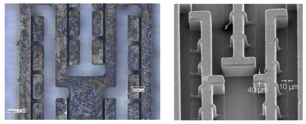 Figure 4 shows, on the left, a photo of an optical microscope of a tool from nickel fabricated for the LIGA process and, on the right, a scanning electron micrograph (SEM) of micro structures molded from that tool [9]. These micro structures were made of two polypropylene (PP) foils, each 150 μm in thickness, embossed at 35 kHz and 100 N pressing force. The micro structures are 120 μm deep, the required ultrasonic energy was 17 J, and the cooling time was 0.8 s. The smallest structures generated have dimensions of 40 μm. The smallest grooves in the molding tool, 10 μm in width, were not filled with polymer.
