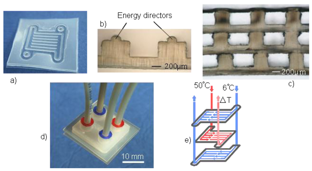 - Burlage, K.; Gerhardy, C.; Schomburg, W.K. PVDF micro heat exchanger manufactured by ultrasonic hot embossing and welding. Proceedings of MME 2010: 21st MicroMechanics Europe Workshop, Enschede, The Netherlands, 25–27 September 2010.