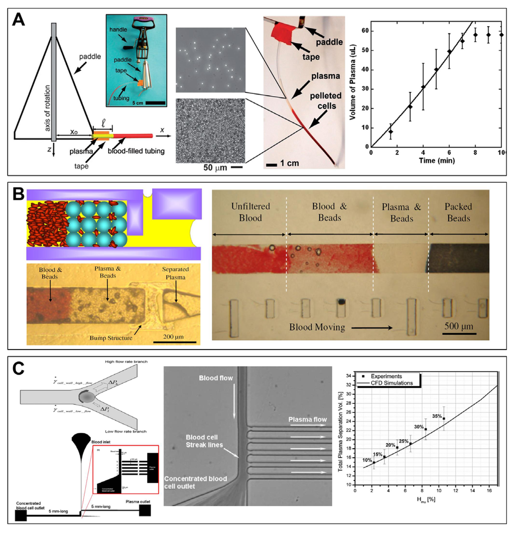 Many clinical tests and research assays frequently require the removal of blood cells from plasma for downstream analysis and diagnosis. A simple diagnostic test of blood plasma for biological substances such as cholesterol, glucose and lactate can be used to evaluate the general state of health of various internal organs. The quantification of individual plasma proteins is also routine and important for diagnosis and monitoring of many diseases including paraproteinaemias, hemoglobinopathies, and genetic abnormalities [10,11]. However, it is critical to remove the large volume of interfering blood cells from whole blood so that the purified plasma can be assessed and diagnosed accurately.