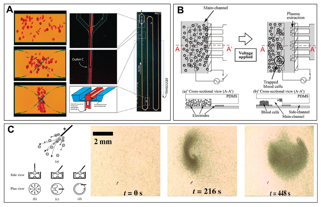 Plasma separation techniques from blood using active energy sources such as acoustophoresis, electrohydrodynamics and dielectrophoresis have also been explored recently [27-33]. Acoustic forces generated by ultrasonic standing waves can be used for plasma separation in microchannels. The radiation force generated on the cells by these acoustic waves moves them into pressure nodes of the standing wave field. By exciting the microfluidic channel with half wavelength width ultrasonic wave, the cells/particles can be focused at the pressure node located at the center of the channel. Thus, pumping blood through the channels, the erythrocytes can be focused at the channel center and removed from the central outlet while the purified plasma can be continuously collected at the side outlets [Figure 2(A)] [27-29]. The device is capable of generating pure fractions of plasma (<6 × 106 cells/mL) at ∼80 μL/min flow rate. Dielectrophoresis (DEP) offers another effective method of separating blood plasma relying on an inhomogeneous electric field between two electrodes to induce electrostatic forces [Figure 2(B)] to trap cells. When polarizable cells (RBCs) are placed in the non-uniform electric field, a net electric force is imparted on the cells due to an induced or permanent dipole. Separation of blood plasma from diluted blood (1:9) using a DEP microfluidic device was demonstrated by Nakashima et al. [33]. Blood is injected into the main channel by capillary force and in the presence of an electric field the RBCs are trapped at the electrodes while cell free plasma is collected downstream. Applying an AC signal of 10 V and 10 MHz, the device is capable of removing about 97% of blood cells to generate 300 nL plasma from 5 μL of blood [33]. Recently, an interesting plasma separation technique based on creating swirling flows in a microfluidic chamber induced by bulk electrohydrodynamics thrust or ionic winds has been reported [Figure 2(C)] [30,31]. Applying a potential that exceeds the threshold ionization voltage for air across a mounted sharp corona electrode tip creates a nearly singular electric field giving rise to a corona discharge. The bulk electrohydrodynamic air thrust generated by the transfer of momentum from collision between the counter-ions with air molecules results in interfacial shear leading to recirculating flows [Figure 2(C)]. The cells suspended in the liquid are thus concentrated towards the bottom of the chamber by these inward radial forces. Using this technique, Yeo and co-workers successfully isolated plasma from RBCs within 200 s applying 0.94 kV voltage and 90 kHz frequency. The separation is efficient with the separated plasma consisting of <0.003% hematocrit cell contamination.
