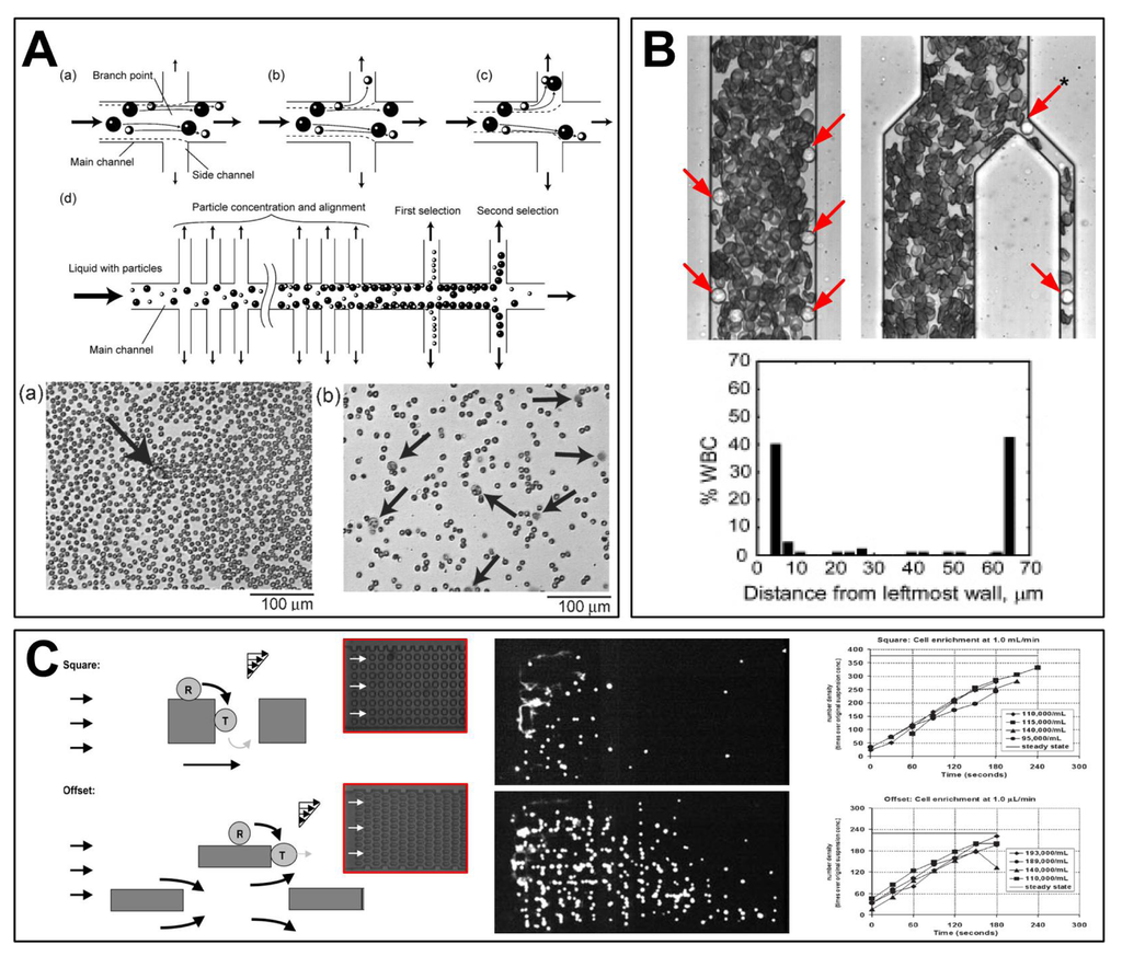 Traditionally, these cells are separated from blood by centrifugation exploiting the differences in the buoyant gravity by using a density gradient solution (Ficoll-Paque™). Besides density, leukocytes and RBCs are also structurally different both in terms of shape and size. Leukocytes are spherical nucleated cells with typical diameters ranging from 6 μm to 10 μm [38-40]. Red blood cells (RBCs) on the other hand have a biconcave disc-like structure with an average diameter of 7–8 μm and 2–3 μm thickness. Due to the high deformability of RBCs aided by the absence of nucleus, membrane-based filters are also commonly employed to filter leukocytes from blood [41,42]. The inherent differences in size and deformability between the RBCs and leukocytes have led to the development of several microfluidics techniques based on the principles of cell retention and retarded cell movement [40,43-45]. The use of pillars in particular is an attractive technique for size and deformability based cell sorting in microfluidic devices. For example, Panaro et al. designed a silicon microchip with rectangular pillars spaced 3.5 μm to separate leukocytes from whole blood for subsequent PCR reactions [43]. The “deterministic lateral displacement” (DLD) or the “bump array” microdevice developed by Huang et al. has also been applied for blood fractionation [Figure 3(A)] [46,47]. The microfluidic device design consists of arrays of micro-pillar structures placed within the main flow channel leading to the formation of multiple cell streams based on size. Cells larger than the critical diameter dc = 20% × 2w (w is the separation gap between two adjacent pillars) follow a deterministic path while smaller cells remain unperturbed moving in an average downward flow direction. The bump array was successfully applied for fractionating blood components by tailoring the design to match the sizes of the blood cells. Apart from achieving 110-fold leukocyte enrichment, the device was capable of fractionating the individual WBC components. However, a processing flow rate of 1 μL/h results in an extremely low device throughput.
