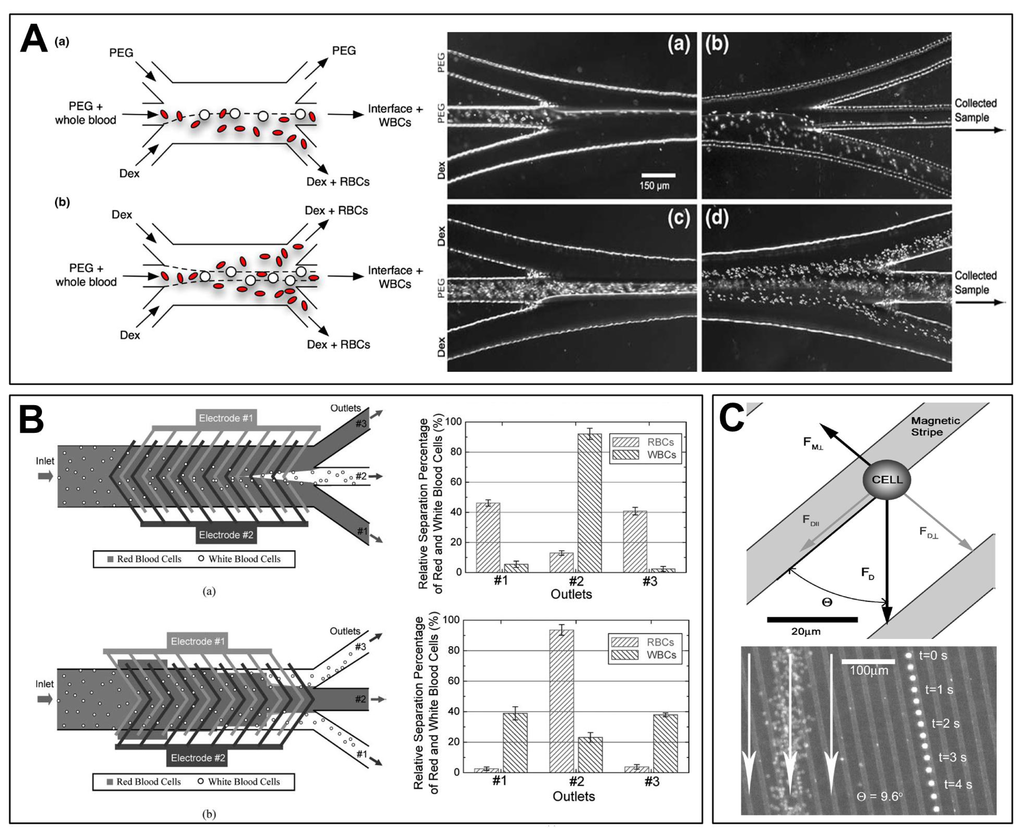 Blood, perhaps the most important biological fluid, performs many fundamental functions to maintain homeostasis; from transporting nutrients and oxygen to tissues and organs to regulating pH and temperature. It also provides an efficient transit system through the vascular network for transport of immune cells for defense against foreign microbes and wound healing. As blood contains a myriad of information about the functioning of the human body, complete blood analysis has been a primary diagnostic test in our healthcare system. Broadly, plasma and cells constitute the two main blood components each with ∼60% and 40% volume fractions respectively. The blood cellular components mainly consist of red blood cells (RBCs), leukocytes and platelets. Other rare-cells including fetal cells during pregnancy and epithelial tumor cells in cancer patients may also be found circulating in blood. Of the ∼5 billion cells per milliliter of blood, red blood cells (RBCs) make up >99% of all cellular components. Due to the vast majority of RBCs, fractionating the various target components from blood has been a challenging problem both from a medical and engineering perspective.