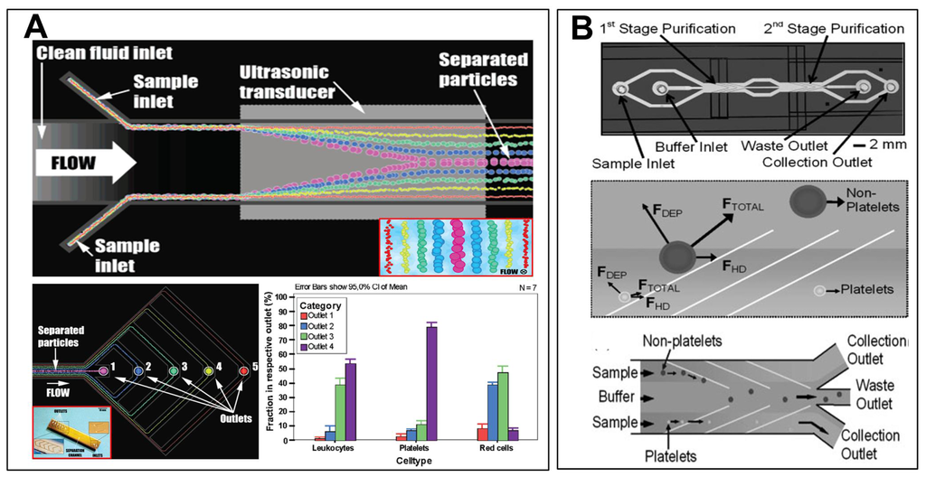 Platelet separation in microfluidic systems has mainly been explored with active separation techniques using acoustophoresis [66] and dielectrophoresis [67]. Platelets can be separated into multiple fractions in a continuous mode via free flow acoustophoresis (FFA) [Figure 6(A)] [66]. A half-wavelength acoustic standing wave generated between the microchannel side walls applies an acoustic radiation force perpendicular to the direction of the flow. By using a combination of FFA and medium density manipulation, high separation efficiency can be achieved with 92% of the erythrocytes ending in the first fraction (center of the channel) while 99% of the platelets collected in the second. Similarly, by exploiting the fact that platelets are the smallest cells in blood and therefore experiences less dielectrophoretic force, dielectrophoresis can be used to extract high purity platelets (∼95%) from diluted whole blood at a throughput of ∼2.2 × 104 cells/s with minimal platelet activation [Figure 6(B)] [67]. Recently, single-step separation of individual platelets from whole blood by micropatterning of platelet-specific protein surfaces on solid substrates has been reported using an interfacial platelet cytometry (iPC) chip [62]. Platelets were separated from whole blood using iPC coated with fibrinogen, von Willebrand factor (VWF), and anti-CD42b antibody printed “spots” ranging from 2–24 μm diameter. The paper reports on tests conducted with blood samples from healthy donors and a Glanzmann's Thrombasthenia patient. As the platelets are allowed to adhere to the surface, the iPC chip enables physiologically relevant platelet bioassays based on platelet/protein-matrix interactions.