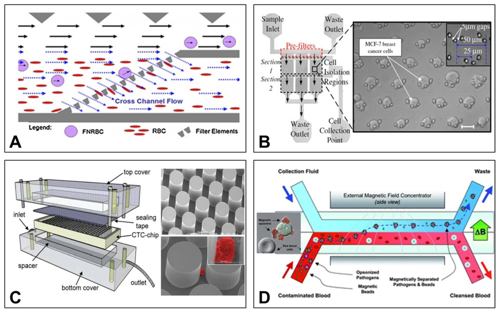 Besides blood constituents, other cells of interest such as circulating tumor cells (CTCs), nucleated RBCs (nRBCs) and microorganisms are also present in peripheral blood, which are of clinical significance and important for disease diagnosis and fundamental research. As these cells usually occur in low abundance (∼1–10,000 cells/ mL of blood (∼109 RBCs)), common macroscale separation techniques such as physical filtration, fluorescence-activated cell sorting (FACS) and magnetically-actuated cell sorting (MACS) have limited success in separating/isolating them mainly due to laborious sample preparations which introduce artifacts or lead to loss of desired cells [68]. Moreover, mechanical stress-induced changes in original cell phenotype using these techniques have also been reported, suggesting the need to develop new tools for separating these rare cells [69,70]. Microfluidic based separation methods are an attractive alternative due to the small length scale and numerous advantages such as reduced sample and reagent volumes, minimize contamination issues and process automation [4,34]. These inherent advantages also make microfluidics ideal in resource-poor settings where problems such as shortage of power supply and refrigeration are limiting the use of expensive and specialized equipment. For example, several microfluidic devices have been developed for malaria detection, which is one of the severest parasitic blood-borne diseases and most prevalent in the poorer countries. The separation principles are mostly based on intrinsic properties of malaria-infected RBCs (iRBCs) such as dielectric differences [71], paramagnetic affinity [72], and change in stiffness [73,74] to separate or enrich them from blood for diagnostic applications. However, as iRBCs constitute ∼0.01–1% in peripheral blood of malaria patients, they are not considered as rare-cell per se and thus excluded in our discussion. In this section, separation of various types of rare cells from blood using microfluidics will be presented.