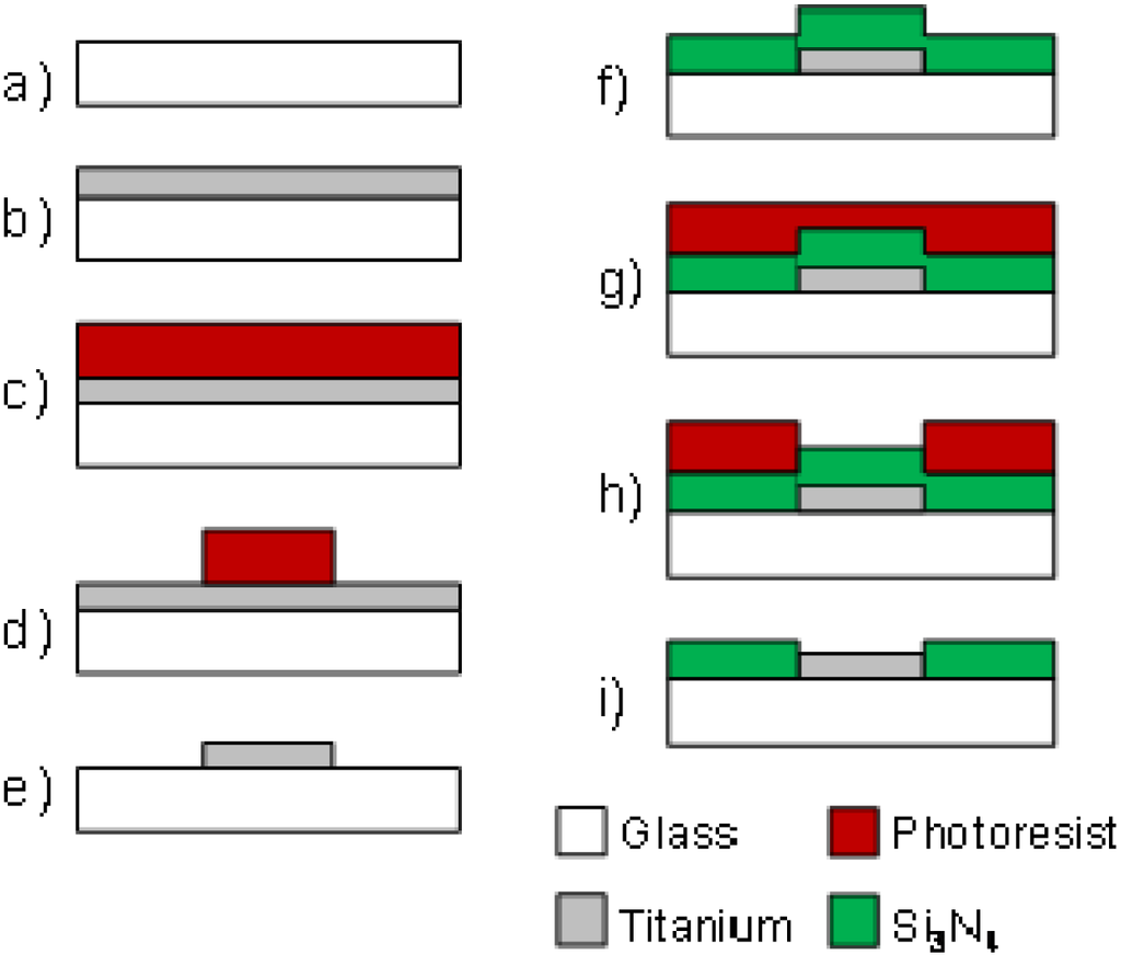 Wet etching (20 H2O:1 H2O2 (30%):1 HF) was used to transfer the microelectrode pattern from the photoresist layer to titanium. After cleaning the wafer from remaining photoresist, a 500 nm layer of silicon nitride (Si3N4) was PECVD deposited as dielectric insulating layer at Optoelectronics Research Centre (ORC, Tampere University of Technology, Tampere, Finland). Lithographic steps for making openings for electrodes and contact pads in the insulator layer were performed with the same procedures as the patterning of titanium described above. After the hardbake step, however, reactive ion etching with SF6 and O2 gases [40] was applied instead of wet etching. In final fabrication step, a short oxygen plasma treatment (O2 30 sccm, RF power 30 W, pressure 30 mTorr), was run in reactive ion etcher (RIE, Advanced Vacuum Vision 320, Advanced Vacuum, Lomma, Sweden) to make the surface hydrophilic.