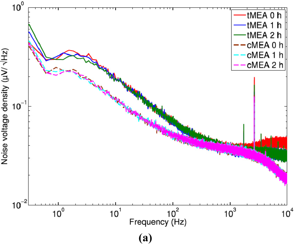 The average measured RMS noises both from three new and three old tMEAs and cMEAs with average deviations along with the area normalized average RMS noises of tMEAs are all shown in Table 1. The results indicate roughly 33% higher noise for the new tMEAs compared to new cMEAs and roughly 90% higher noise for the old tMEAs compared to old cMEAs. The lower noise of old MEAs compared to new MEAs is probably mainly due to electrode surface modifications caused by long term exposure to cell and culture medium. At least for tMEAs, but possibly also for cMEAs, the batch to batch variations partly explain the noise variations. The uncontrolled long term natural oxidation of titanium may partly explain the ten times larger deviation in average RMS noise from MEA to MEA observed in tMEAs compared to cMEAs. Another explanation for the larger deviation is tMEAs' presumably bigger deviation also on microelectrode sizes and other MEA structure dimensions compared to cMEAs.