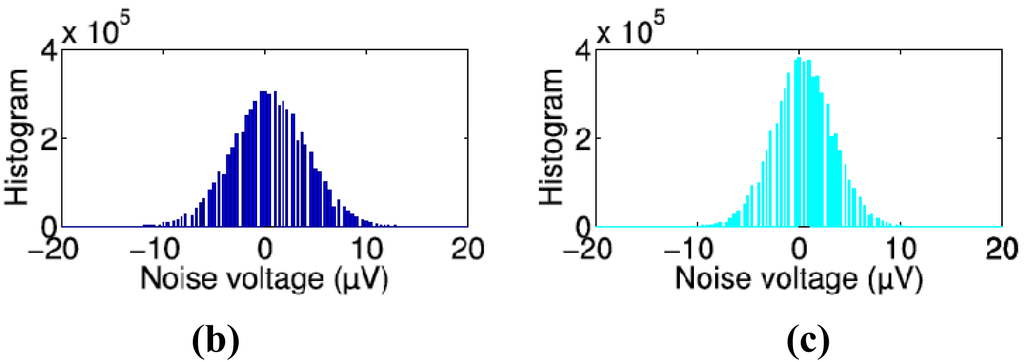 Noise voltage spectra over the frequency range from 0.3 Hz to 10 kHz were plotted using the Welch estimate method [42] with the 50% overlapping and window length of 60615 samples. Estimates were calculated with a Measurement Signal Processing (MSP) toolbox [43] for Matlab. Also noise voltage histograms with 200 bins of width 20 μV were calculated for the microelectrodes.