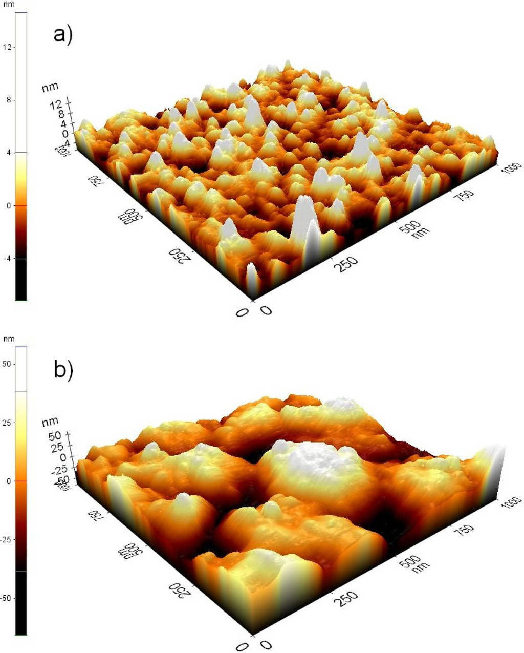 As one potential source for lower impedance is the bigger effective surface area, we also performed atomic force microscopy (AFM) measurements (XE-100 AFM, Park Systems, Suwon, Korea) to assess effective surface area difference between titanium and TiN surfaces. For each MEA type 1 μm × 1 μm scans including 256 × 256 pixels were performed in a tapping mode.