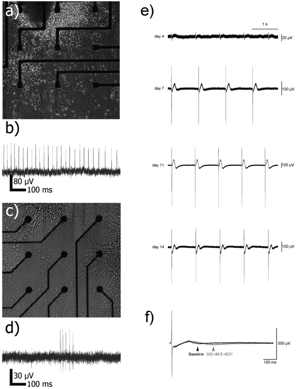Differentiation of hESC line H7 was performed as described earlier [47]. The MEAs were coated as follows: 30 minutes with fetal bovine serum (Gibco, Invitrogen) after which they were washed twice with sterile water and one hour with 0.1% gelatine type A (Sigma-Aldrich). After coating the MEAs, the spontaneously beating cardiomyocyte aggregates, excised from cell cultures mechanically, were plated onto the electrode areas in cell culture medium consisting of KO-DMEM (Invitrogen) supplemented with 20% FBS (Invitrogen), 1% NEAA (Lonza), 1% Glutamax (Invitrogen), and 50 U/mL penicillin/streptomycin (Lonza). The cells were cultured for 14 days in vitro on four tMEAs and on three cMEAs. After 14 days in culture on MEA, baseline electrical signal was recorded and the effect of E-4031 (Alomone Labs, Jerusalem, Israel), a known blocker of human ether-a-go-go potassium current at the concentration of 300 nM was analyzed in order to test whether tMEAs were sensitive enough to detect changes in the cardiac repolarization current.