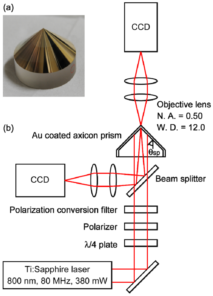 Figure 1(b) shows the optical setup for demonstrating plasmonic nanofocusing with a metal (gold)-coated axicon prism. Laser excitation was provided by a mode-locked Ti:Sapphire pulsed laser (Spectra-Physics, Tsunami 3960; wavelength = 800 nm; pulse width = 80 fs; repetition rate = 80 MHz). The Gaussian collimated beam was focused on the gold-coated axicon prism for the excitation of surface plasmons at the side surface of the prism with the Kretschmann configuration. Radial polarization, azimuthal polarization, and linear polarization were obtained by employing a quarter-wave plate, linear polarizer, and polarization conversion filter (Photonic Lattice, Inc., SWP-800), respectively. The reflection and scattering images in each polarization incidence were captured by a charge-coupled device (CCD) camera. An objective lens (Mitutoyo, M Plan Apo NIR 100×, N.A. = 0.50) with a long working distance of 12.0 mm was employed to observe the scattering light from the prism apex.