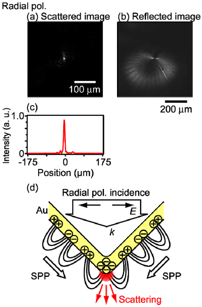 Observed (a) scattering and (b) reflection images for radial polarization incidence. Scattering is observed only from the apex. The reflection intensity is fairly dark due to the surface plasmon excitation; (c) Line profile of the intensity at the center of the scattering image; (d) The mechanism of the scattering from the apex is schematically explained. Constructive interference of surface plasmons occurs at the apex.