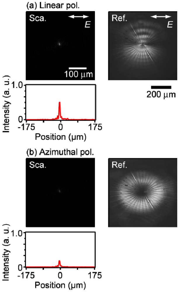 Figure 3 shows the intensity distributions of the scattering and reflection images for the linear and azimuthal incident polarizations. A comparison of the line profiles shown in