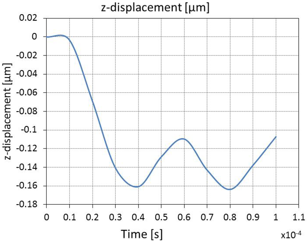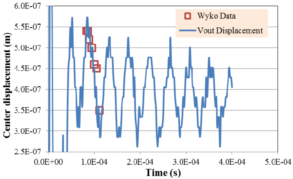 Figure 8 shows the time progression of the vertical displacement of the center of the membrane. As predicted by the theory and observed in the experimental data, the membrane will experience a static displacement and a dynamic displacement. The static displacement is lower than that predicted by the theory presented in the previous sections, but the simulation results match what is observed experimentally. This difference could be due to the choice of the parabolic heat transfer model instead of the more accurate hyperbolic model that is suggested by [11]. We are not concerned about this initial displacement as our sensor application relies on the cyclical vibration that takes place after this initial displacement; the dynamic displacement.