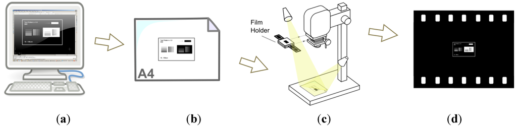 (a) Computer aided designed (CAD) design of mask patterns; (b) Scaled print (typically 10:1) of the mask patterns on a paper sheet; (c) Mask patterns optical reduction and transfer from paper to film by reversal use of an enlarger; (d) The film photomask after the development process.