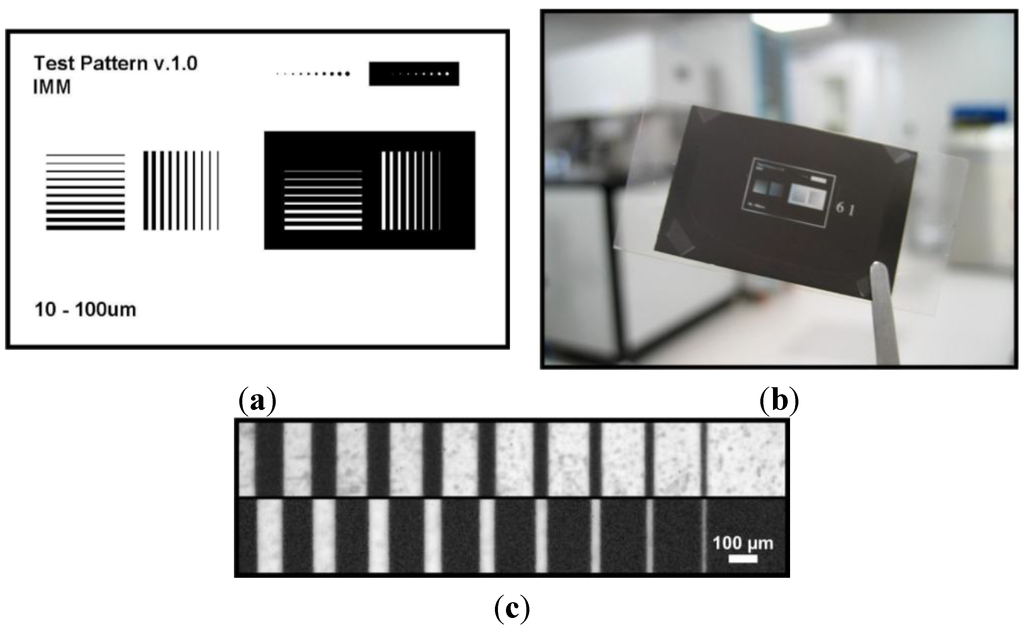 (a) Test pattern used for optimize the reduction parameter. It contains lines and dots in black and white with dimensions from 10 µm to 100 µm. (b) Photo of the impressed photographic film. (c) Optical image of test pattern lines.