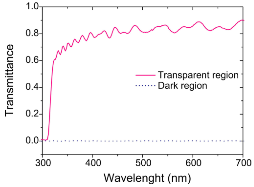 Figure 3 shows the transmittance by transparent and dark regions of photomask in the near UV and optical wavelength range. Starting from 325 nm, the transmittance in the transparent region is higher than 60%, while in the dark region is lower than 0.2% in the whole wavelength range examined.