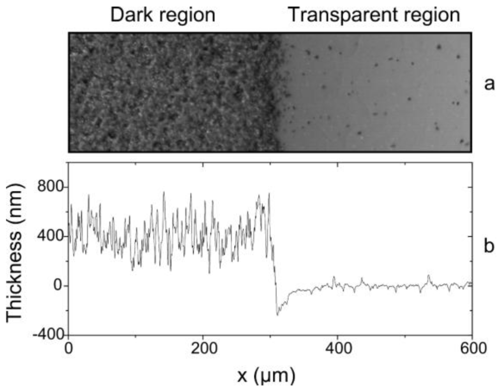 Figure 4a it is possible to observe the optical image of the film which is clearly composed by grains that are obviously absent in classical photolithographic masks. It has an average thickness of 410 nm and a roughness of 120 nm (see