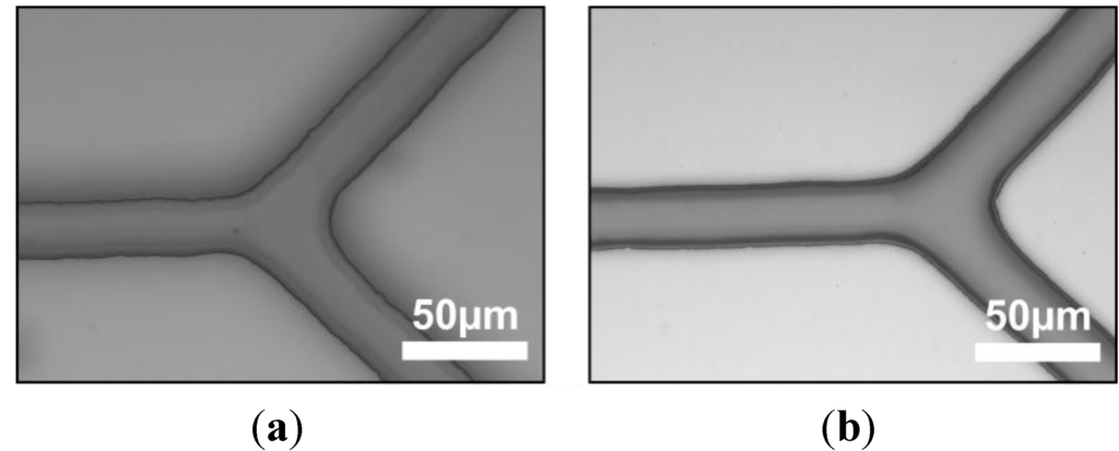 SU-8 Y-shape channel impressed with the same mask using (a) the mask aligner and (b) the UV Box (SU-8, thickness: 10µm).