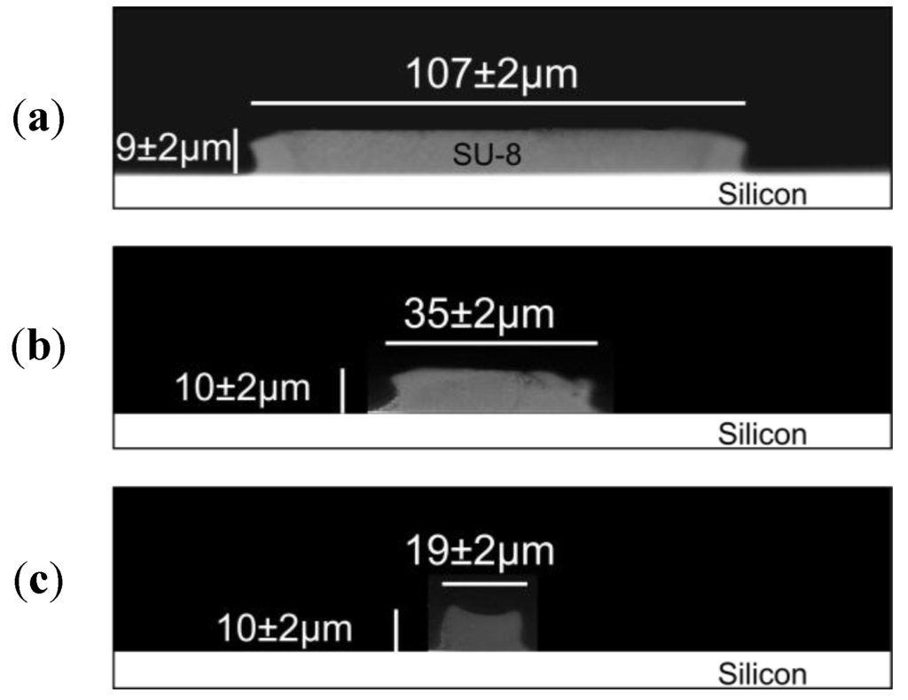 Microscope images of microchannel cross sections with three different widths, (a) 107 µm; (b) 35 µm; (c) 19 µm, realized in SU-8 on a silicon wafer (white zone).