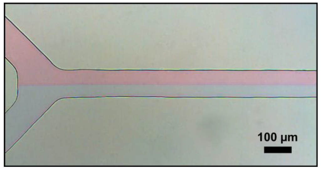 Figure 7, two colored stream flow in parallel without any mixing, due to the low Reynolds number. Non-vertical sidewalls are not a problem for laminar flow since the cross section is uniform along the channel. We can conclude that there is not any turbulence induced by wall shape irregularities in the microchannel.